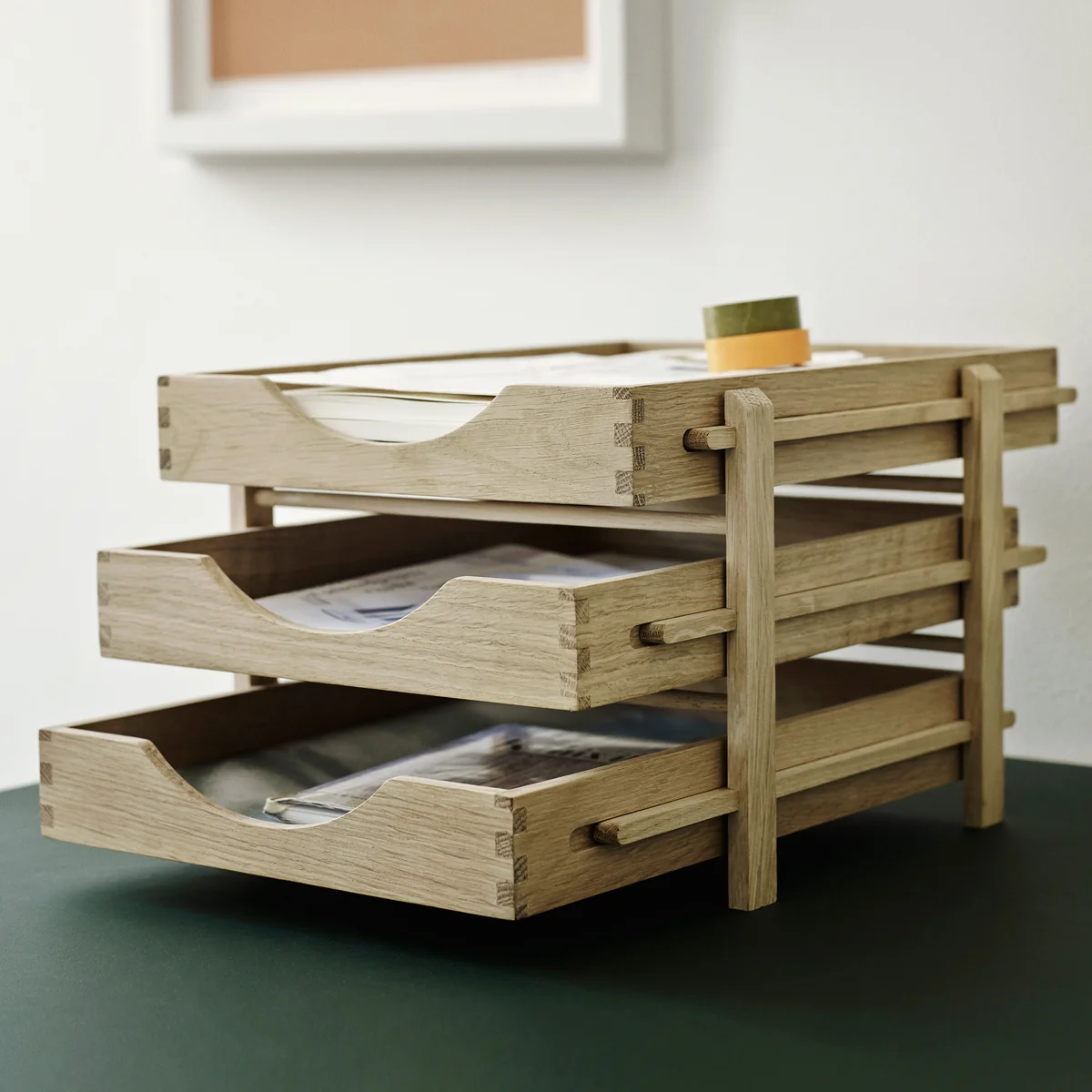La corbeille à courrier Dania est fabriquée par Skagerak en bois de chêne massif certifié FSC®. Les différents tiroirs peuvent être retirés pour permettre un meilleur accès aux documents dans la boîte de classement. Grâce à ces caractéristiques classiques mais centrales, le Letter Tray se distingue nettement des autres organiseurs en bois.