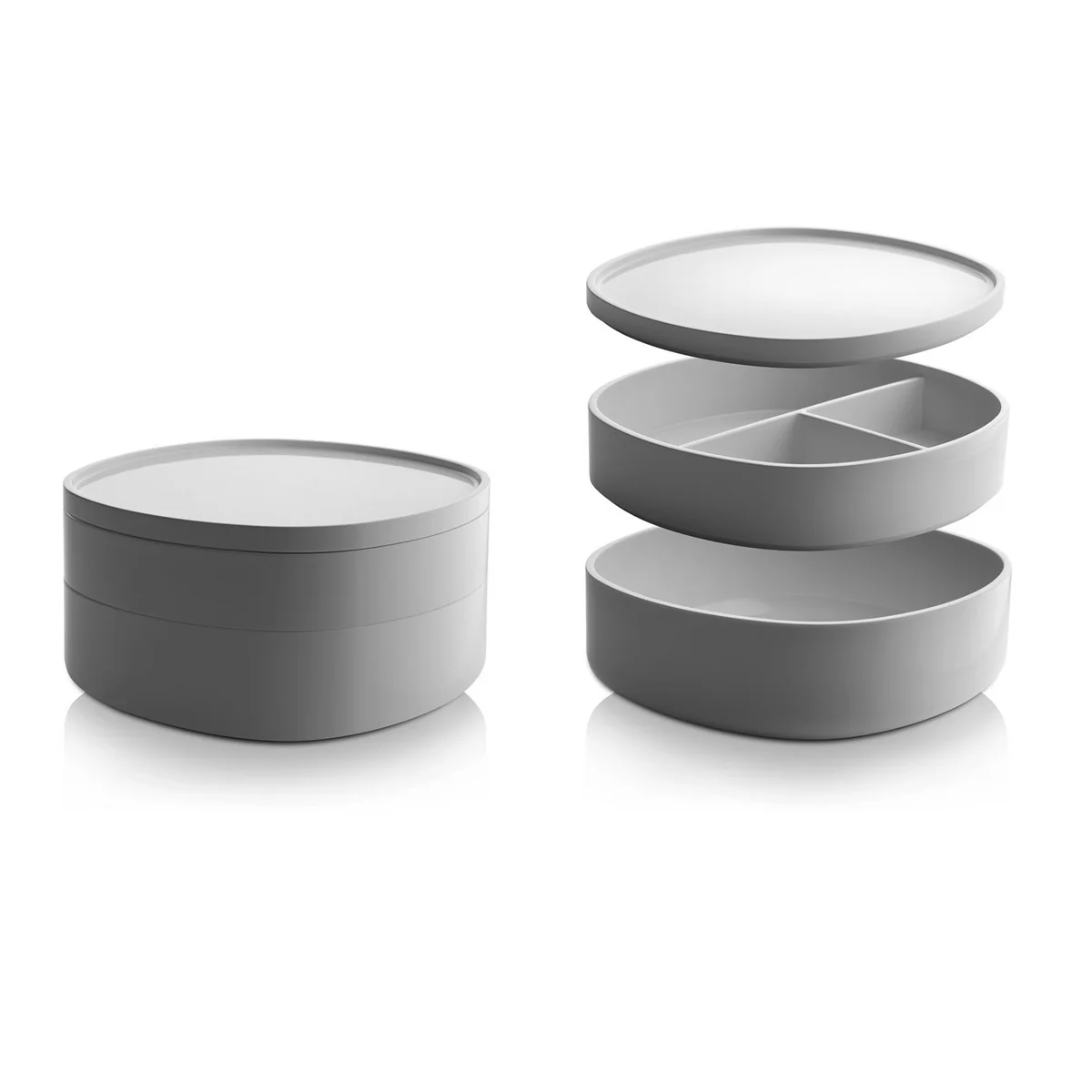 Le récipient de salle de bain du designer Piero Lissoni donne une élégance inattendue aux objets simples. Nombreux petits objets trouvent leur place dans la boîte à trois compartiments Birillo - par exemple les élastiques, les barrettes, le recourbe cils ou le maquillage. Le récipient inférieur accueille les plus grands ustensiles, tandis que le récipient supérieur est divisé en trois parties. Chaque ustensile trouve donc sa place dans votre salle de bain.