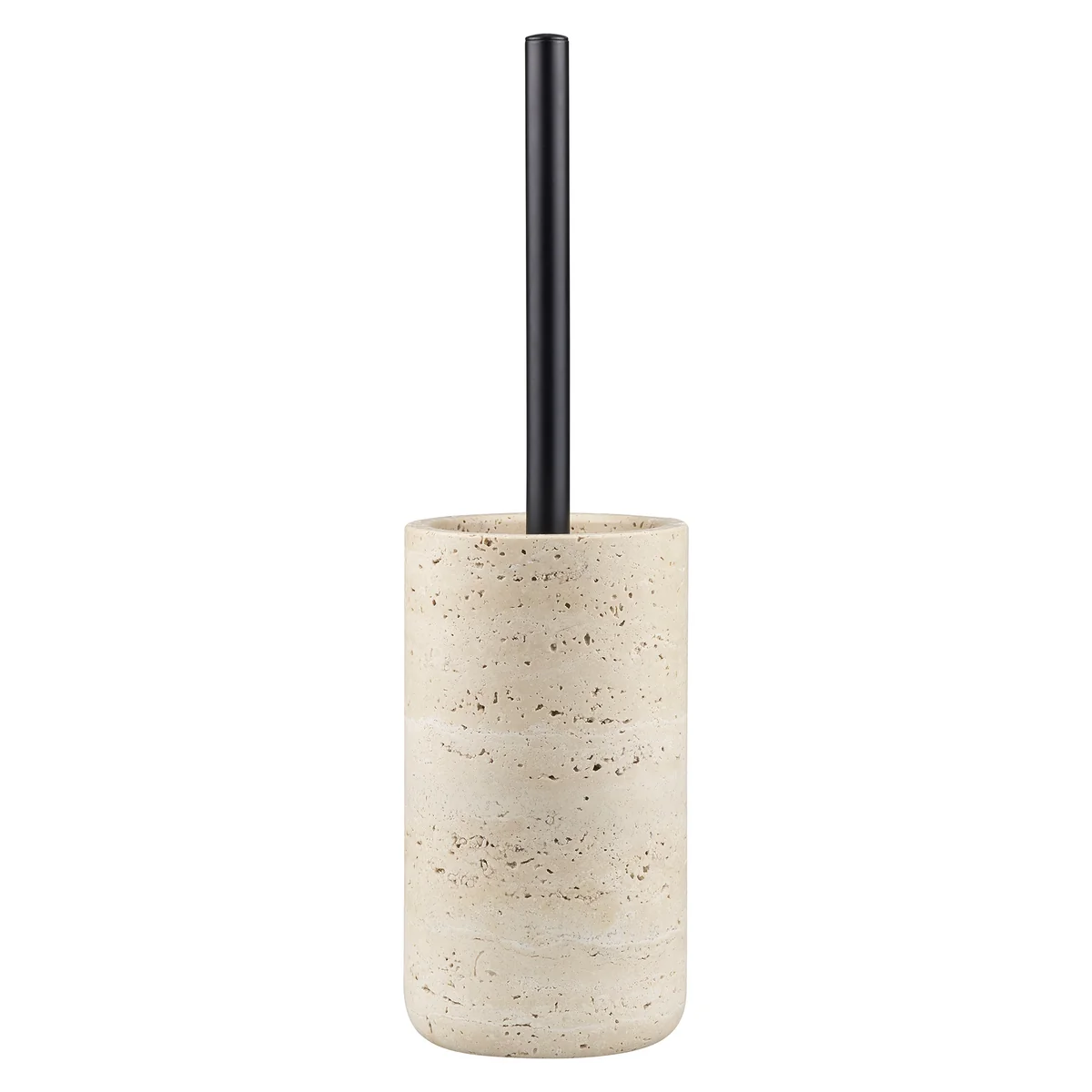 Avec son pied stable et son poids solide, le porte-brosse de toilette reste bien en place sur le sol. Il est équipé d'une poignée métallique noire et d'une tête de brosse assortie. Peut être combiné avec d'autres articles de la collection Travertine pour créer un design de salle de bains harmonieux et stylé.