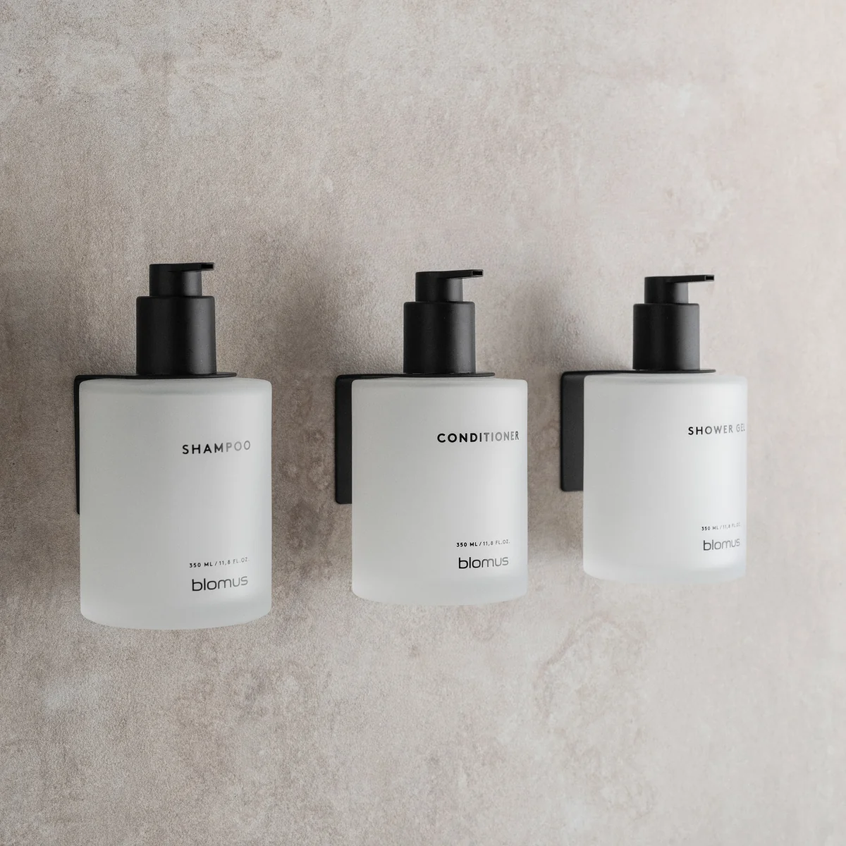 Le support mural fourni, en métal mat et revêtu par poudre, s'harmonise parfaitement avec les têtes de pompe noires mates des flacons. Les bouteilles peuvent ainsi être montées au mur ou placées confortablement dans la douche ou sur le bord de la baignoire. Les vis et les chevilles fournies permettent de fixer le support mural en toute sécurité.