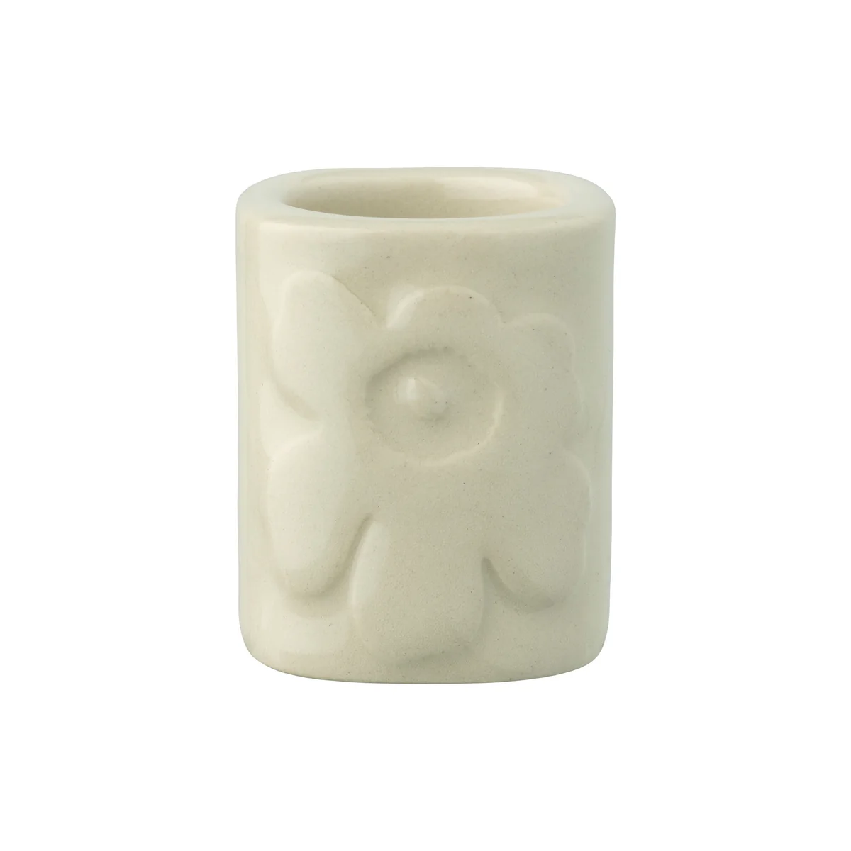 Le porte-brosse à dents Unikko allie une utilisation pratique à un design intemporel. Fabriqué en faïence avec un émail transparent, il présente la couleur naturelle du matériau et donne ainsi une impression de calme, de qualité et d'authenticité. Le motif Unikko gaufré confère au récipient une structure discrète mais unique et en fait un élément décoratif sur le lavabo ou l'étagère de la salle de bains.