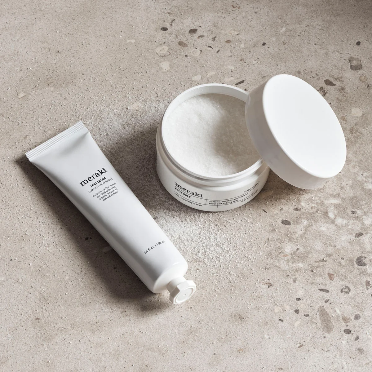 Chouchoute un ami ou un être cher avec ce luxueux coffret cadeau de Meraki . Il contient un sel pour les pieds et une crème pour les pieds qui détendent et revitalisent les pieds fatigués. Le sel pour les pieds adoucit les pieds, les apaise et les revigore après une longue journée. Profite d'un bain de pieds relaxant, enrichi des senteurs rafraîchissantes de l'eucalyptus, de la menthe et du citron vert, pour une pause bienfaisante. Pour finir, soigne tes pieds avec la crème pour les pieds qui les nourrit et les adoucit grâce à l'extrait de moutarde bio et à l'huile de sésame bio. Parfait pour un moment de soin de soi et de détente.