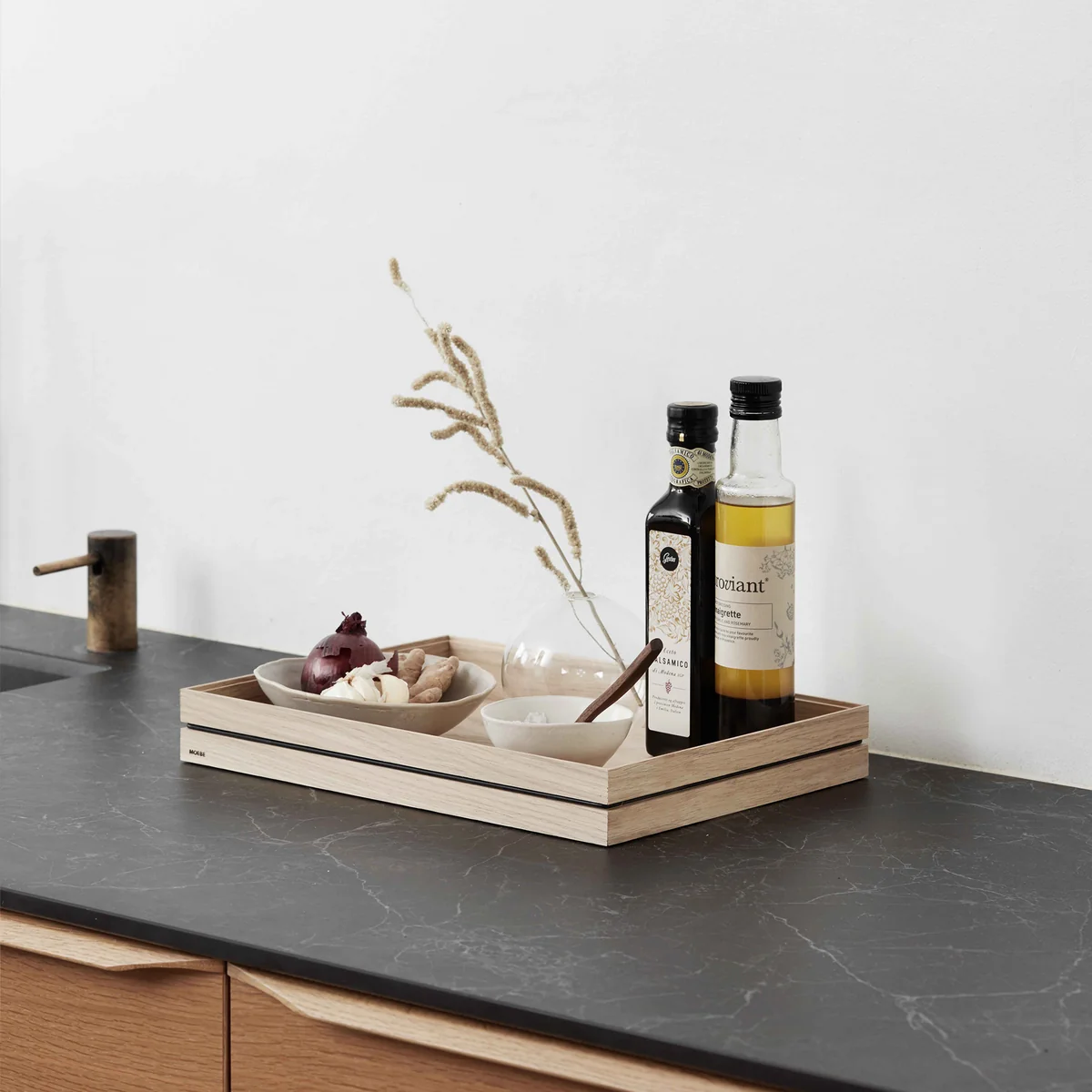 Le site Organise Le stockage de Moebe est réalisé en bois de chêne non traité et maintenu par un élastique. Les deux tailles disponibles peuvent être combinées l'une avec l'autre et sont également empilables.