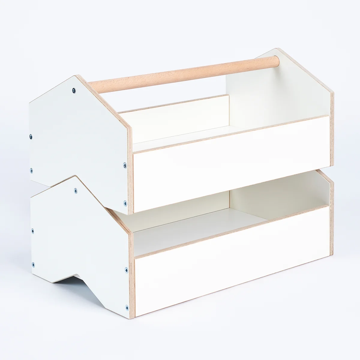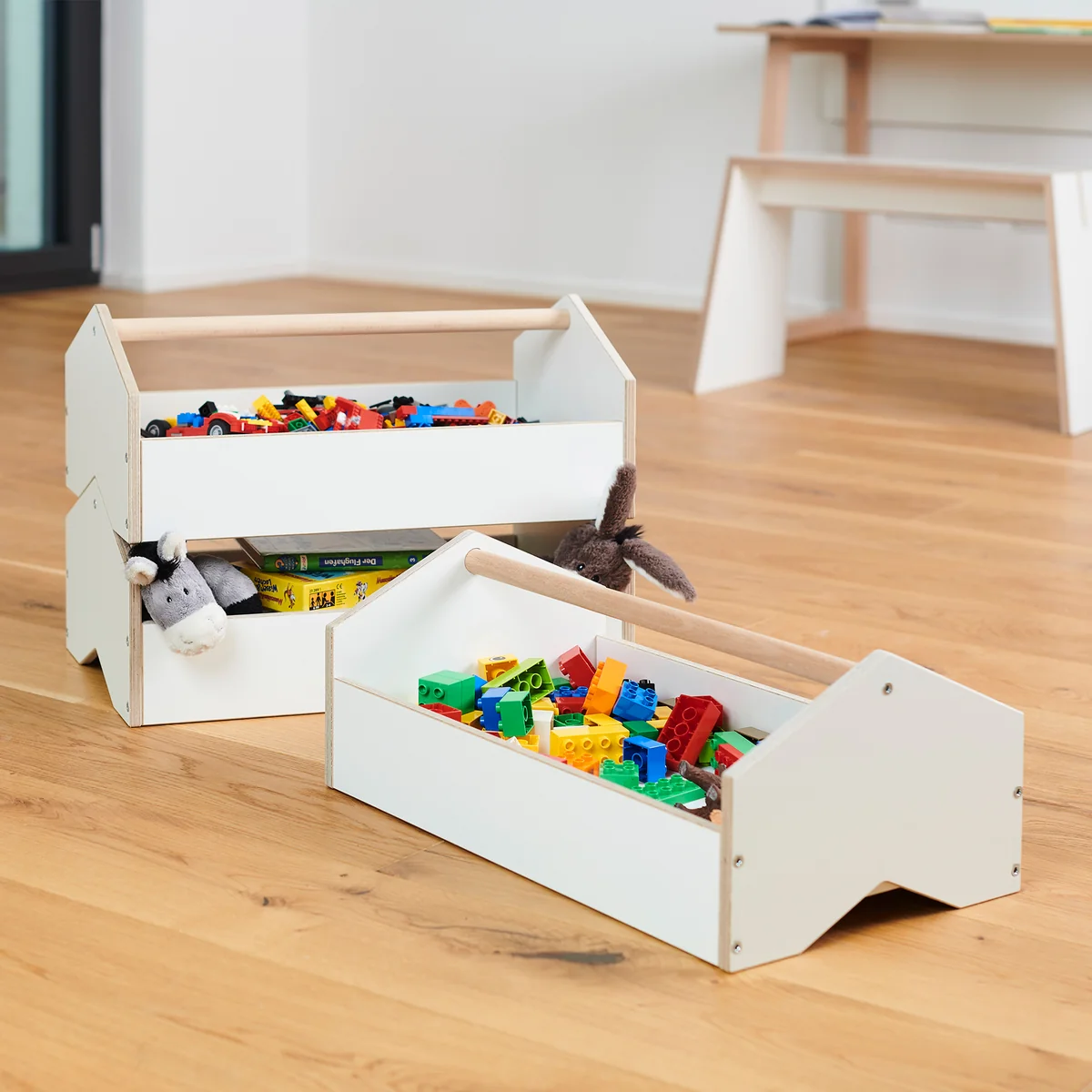 Le site kiste La boîte de rangement de Tojo ressemble à une boîte à outils et sert à ranger les petits jouets. Les briques Lego, les figurines, les voitures miniatures et les petites peluches trouvent leur place dans la salle des fêtes. kiste leur place. Les boîtes de rangement peuvent être simplement empilées les unes sur les autres. Cette solution est particulièrement peu encombrante et permet de disposer de beaucoup d'espace de rangement. Très pratique, le contenu est toujours à portée de main, même dans les boîtes empilées. Grâce à la grande poignée, les boîtes peuvent également être transportées ou empilées à tout moment.