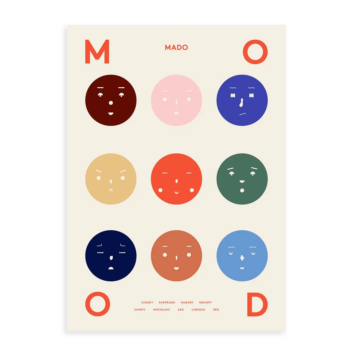 Le poster Mood montre tous les sentiments que l'on éprouve dans la vie - que l'on soit jeune ou moins jeune, c'est toujours une bonne idée de parler et de comprendre les sentiments que l'on éprouve au quotidien, et ce volontiers de manière amusante et colorée. Le poster Mood fait partie de la série MADO, qui est le fruit d'une étroite collaboration entre les deux bureaux de design de Copenhague, All the Way to Paris et Paper Collective .