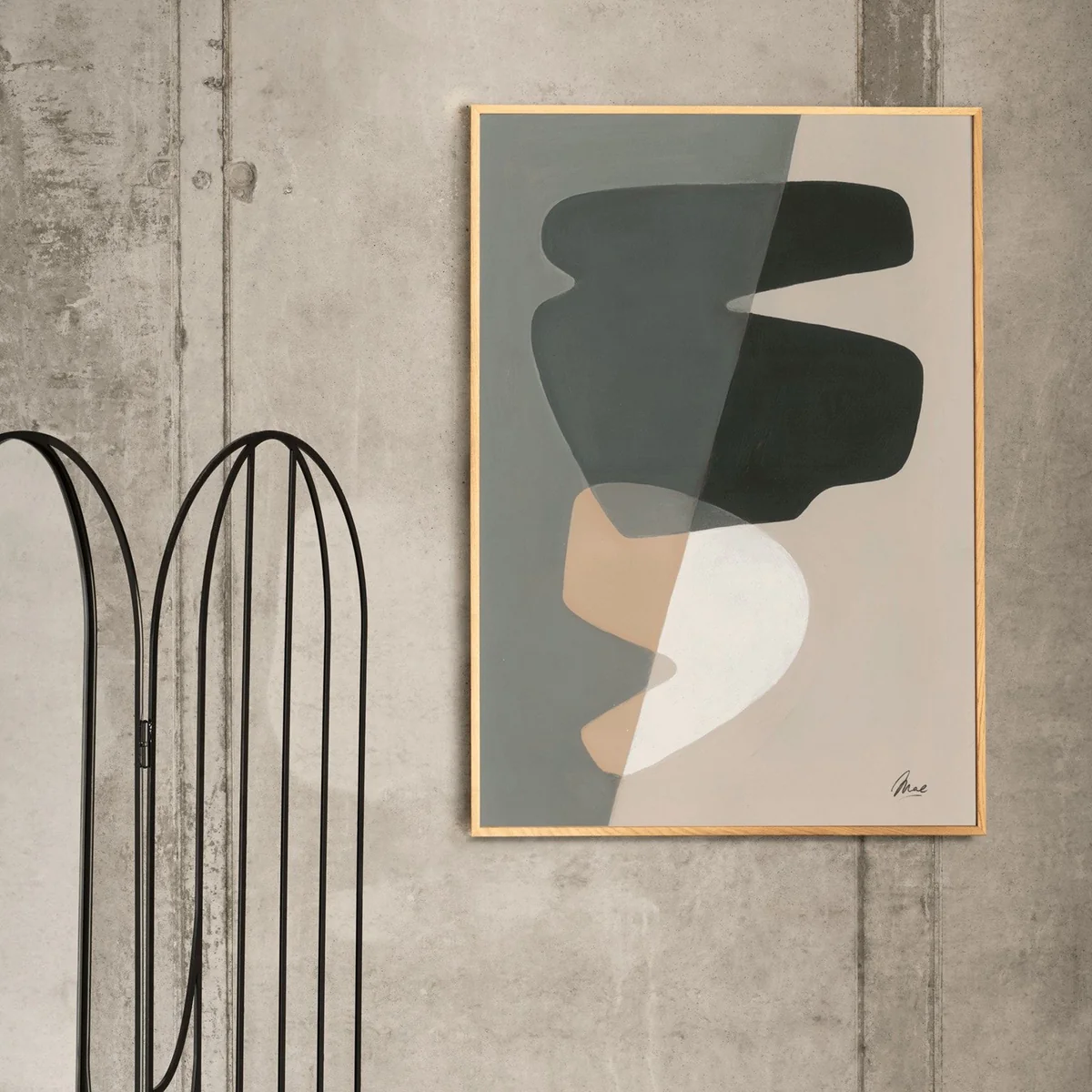 La composition 03 représente une série de formes organiques qui sont mises en évidence sur un fond gris clair et chaud. Les formes en forme de galets se déclinent en nuances de blanc et de noir, interrompues par un ocre plus intense et une petite touche de rose. Apaisant et audacieux.