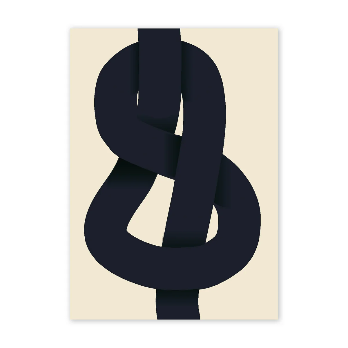 L'affiche The Knot de la designer danoise Nina Bruun montre une large ligne de nœuds, fluide, sous la forme d'une impression graphique. Le jeu d'ombres tente de donner une impression de profondeur, ce qui donne au motif un aspect particulièrement vivant. Le bleu profond de la ligne nouée crée également un contraste fort et dramatique avec le fond beige.