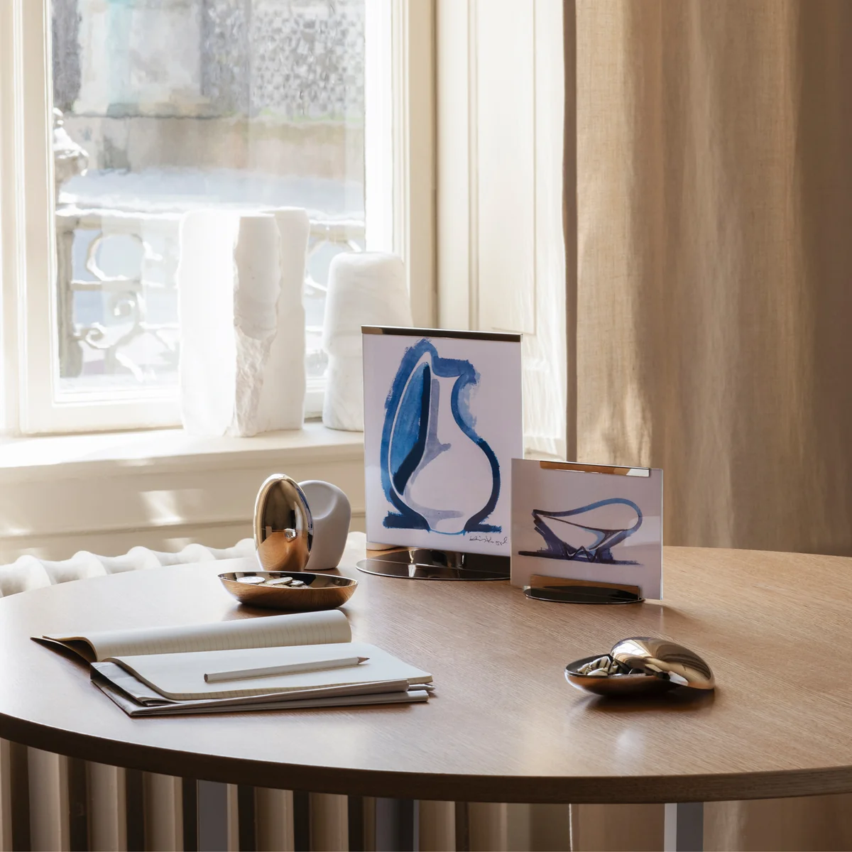 Avec le cadre photo Sky, Georg Jensen donne à un cadre photo classique un aspect moderne. L'image est simplement placée entre deux vitres maintenues par des éléments en acier inoxydable. Selon que la photo est prise au format portrait ou paysage, les volets peuvent être alignés en conséquence. Si l'image est également ajustée avec précision au cadre, elle donne l'impression de flotter.