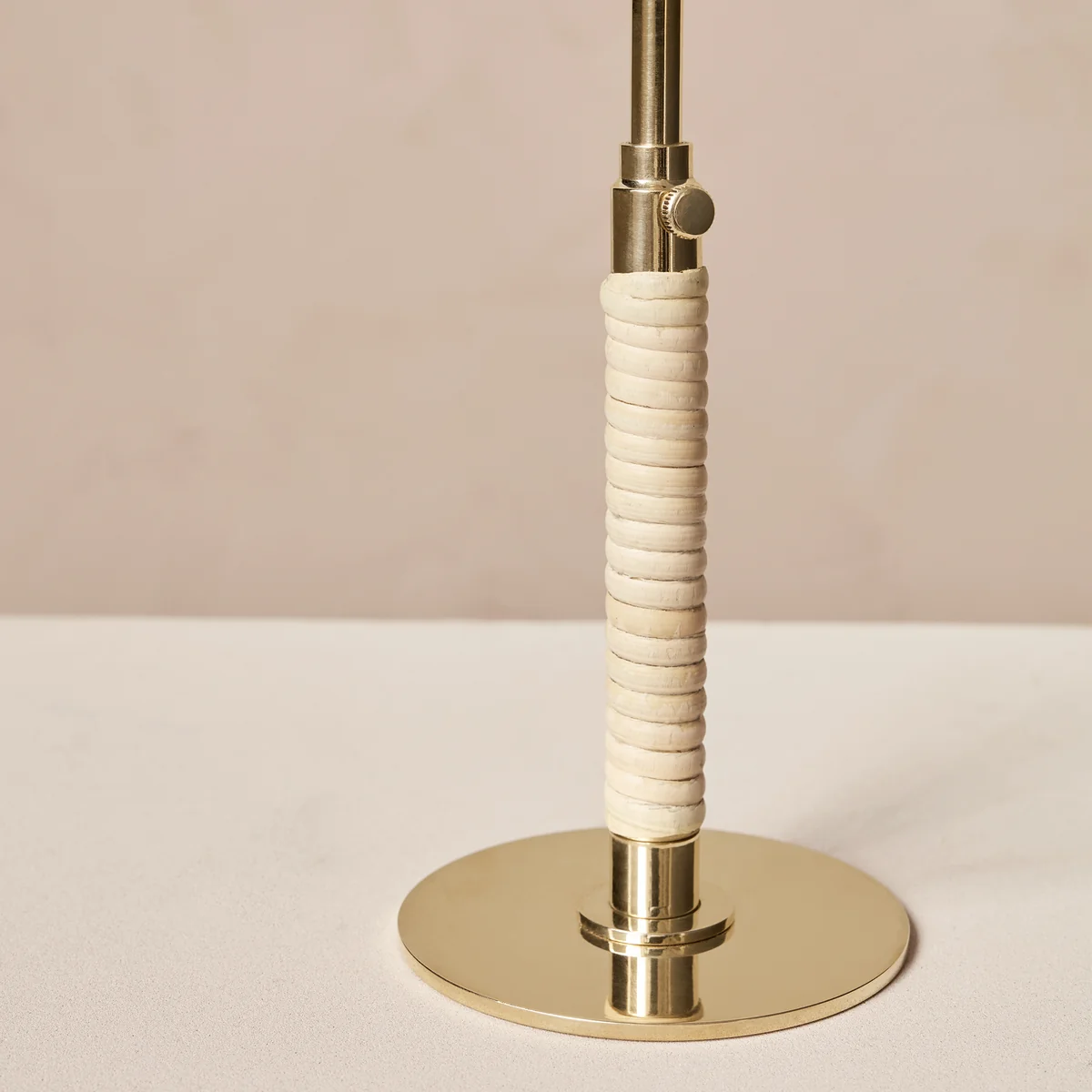 Le bougeoir Duca du studio de design danois Krøyer-Sætter-Lassen pour Audo se distingue par la combinaison de différents matériaux ainsi que par sa fonction particulière : En desserrant la vis sur la fine tige, la hauteur du bougeoir peut être ajustée pendant la combustion de la bougie. Fabriqué en laiton poli ou bruni et détaillé avec du rotin enroulé autour de la moitié inférieure, ce design simple mais efficace confère intimité et chaleur à son environnement.