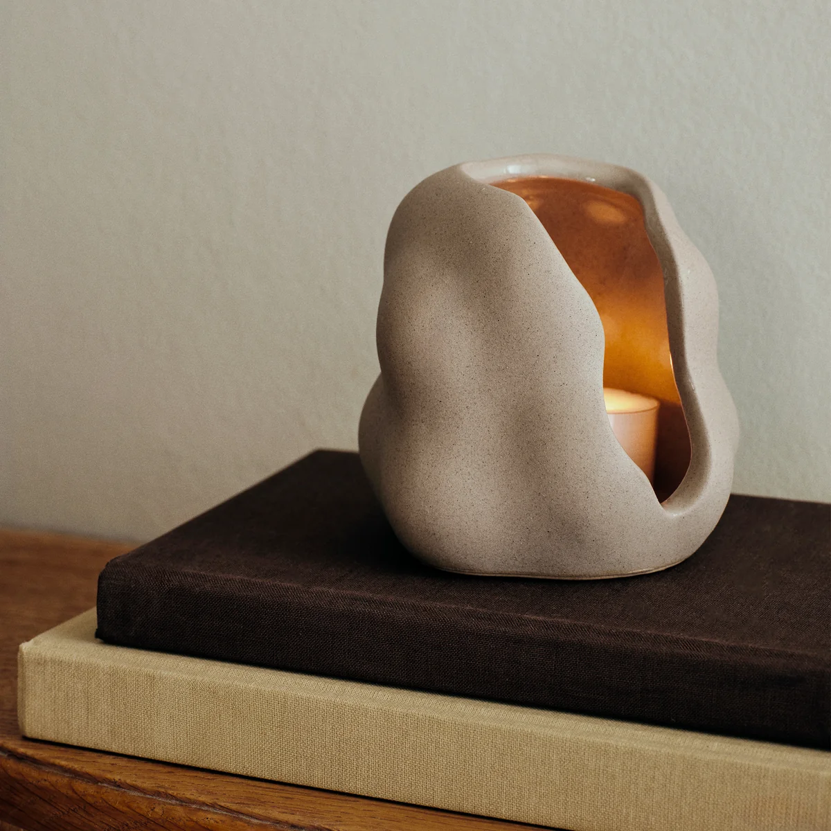 La surface rugueuse confère un charme organique, tandis que l'intérieur émaillé souligne encore la magie de la lumière des bougies. La forme unique rappelle une petite grotte qui entoure délicatement la bougie ronde et apporte chaleur et sérénité dans chaque pièce. Grâce à sa lumière d'ambiance, le bougeoir Hekla Le chandelier dégage une impression de calme et transforme son environnement en une oasis élégante et confortable.