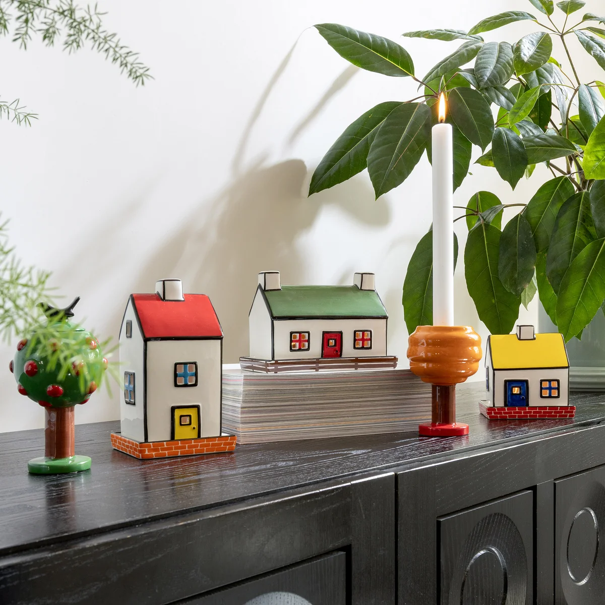 Le site Haines a été conçu en collaboration avec le céramiste et illustrateur anglais Hal. Haines a été conçu. La silhouette en forme d'arbre, peinte à la main dans des couleurs vives, allie un design fonctionnel à une conception narrative. Le bougeoir convient aussi bien aux bougies cylindriques qu'aux bougies chauffe-plat et apporte une atmosphère ludique et colorée dans chaque pièce. Se combine idéalement avec la maison pour bougies à chauffe-plat de Hal Haines - pour un village miniature individuel plein de lumière et de fantaisie.