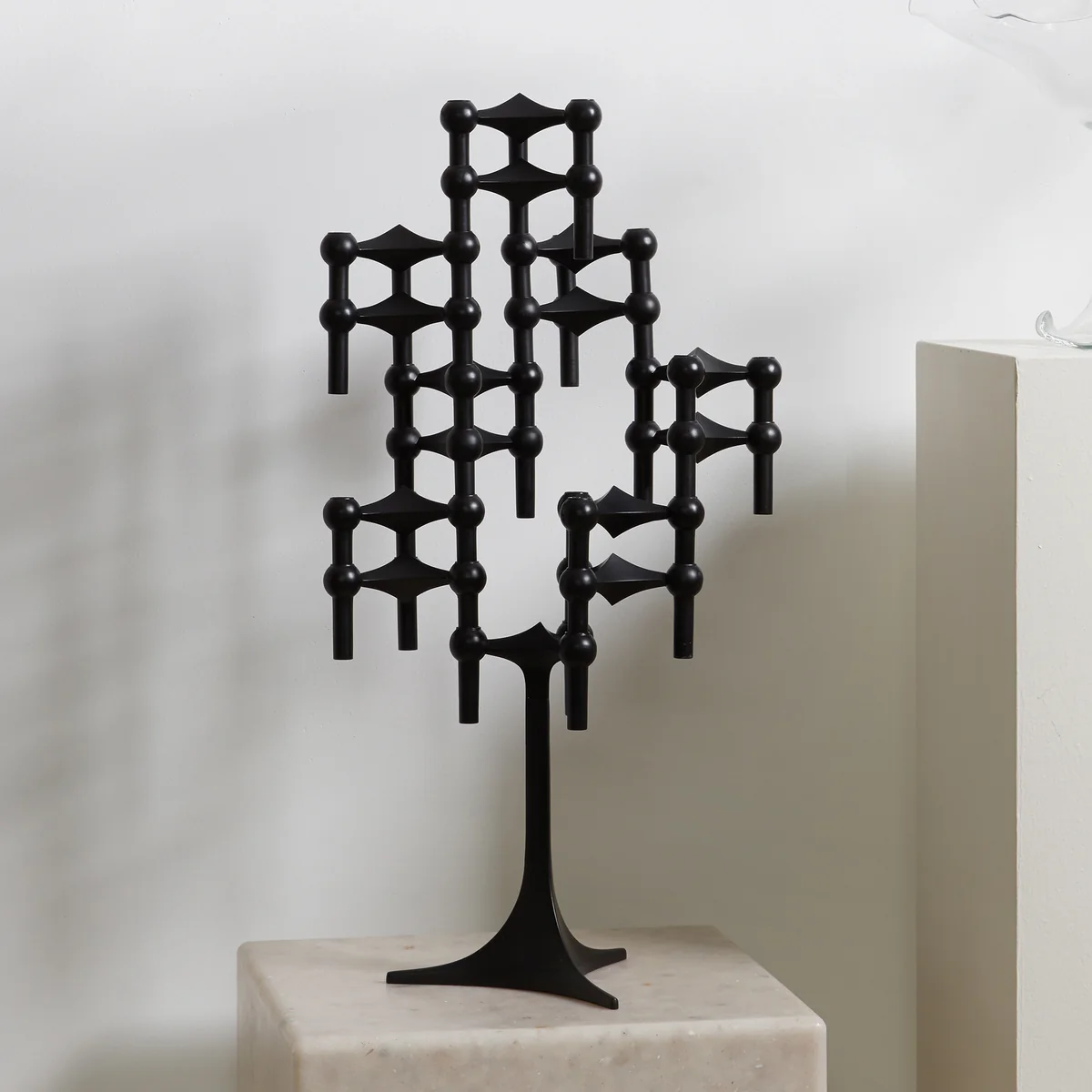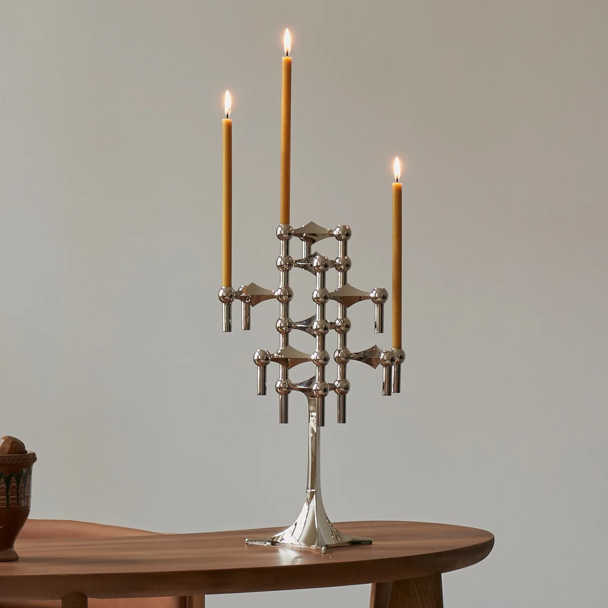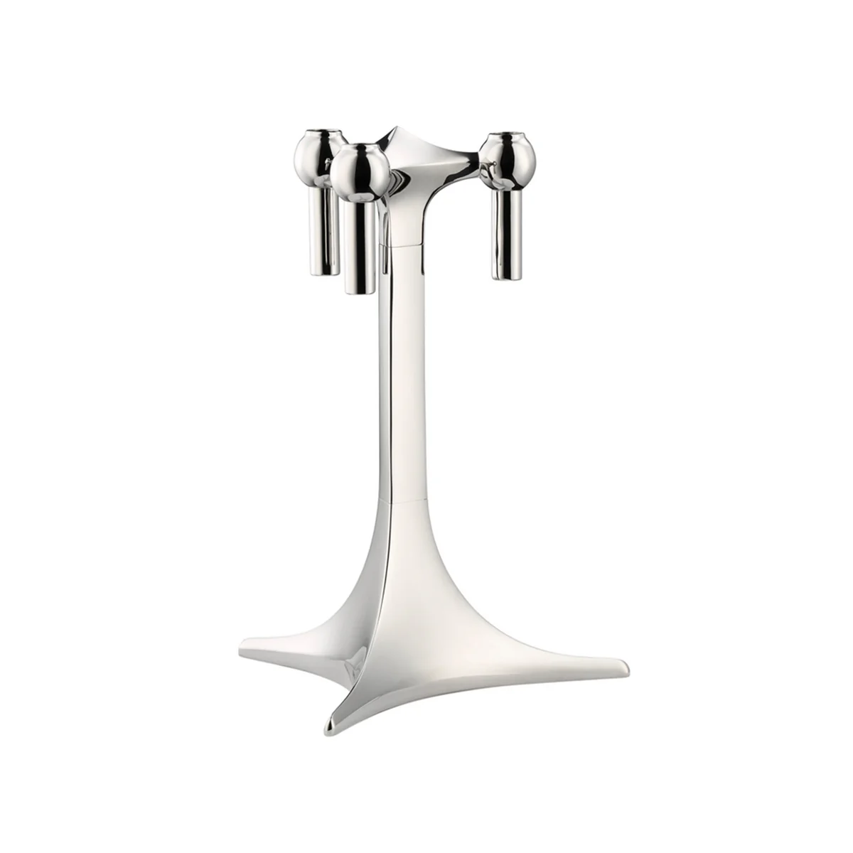 Un chandelier de 23 cm de haut dans le style du légendaire Stoff Nagel design, il est très élégant. Le chandelier peut accueillir trois bougies ou peut servir de base à un chandelier sculptural composé individuellement. Il est disponible en chrome, noir ou laiton.