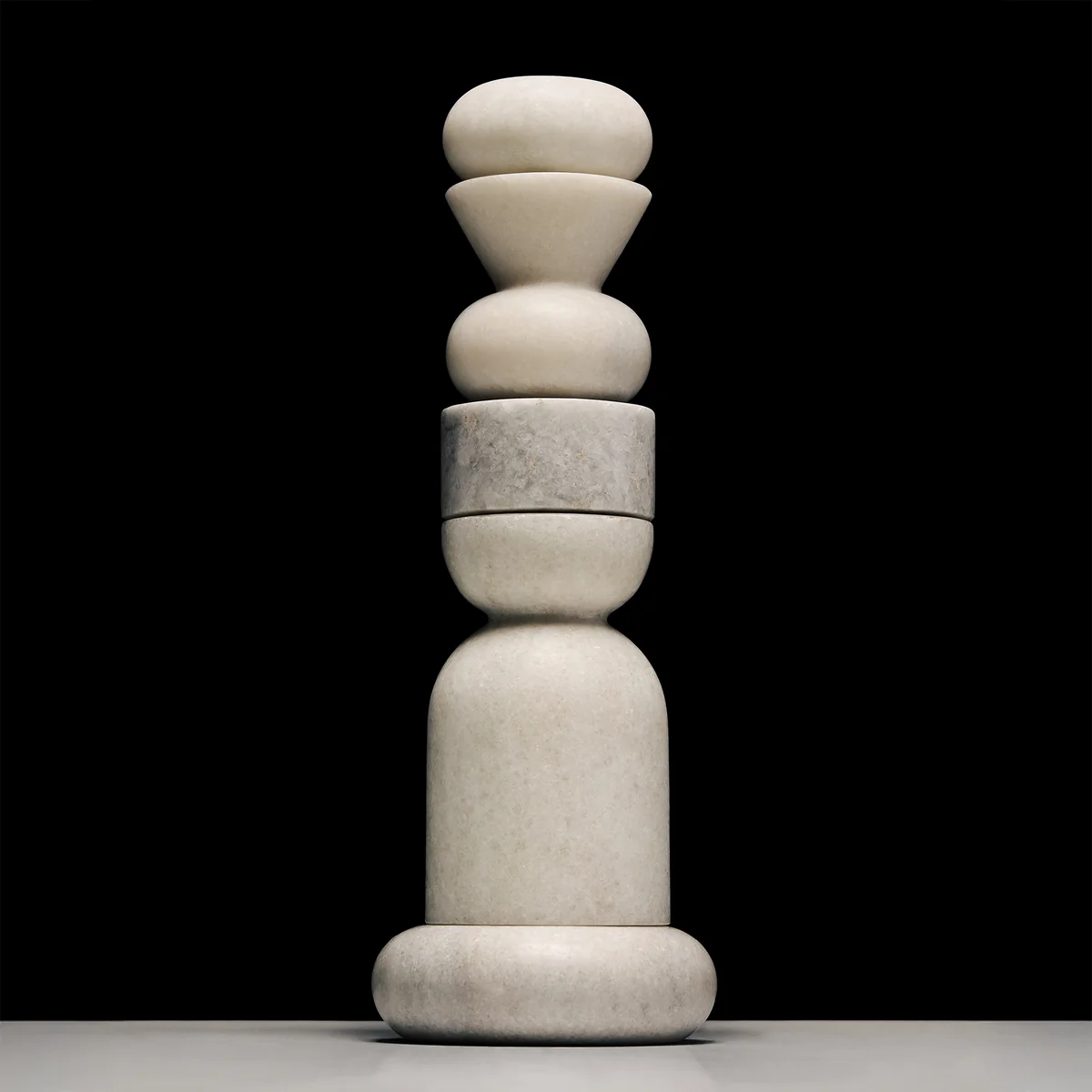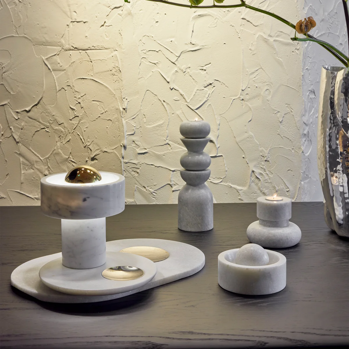 Le chandelier à cinq pièces de la collection Stone allie élégance intemporelle et design fonctionnel. Fabriqué dans le même marbre noble que celui utilisé pour le Taj Mahal, chaque élément est une pièce unique aux veines naturelles. Les différents éléments peuvent être empilés les uns sur les autres, ce qui permet d'adapter individuellement le candélabre et de le mettre en scène de multiples façons - que ce soit comme pièce individuelle sobre ou comme composition marquante.