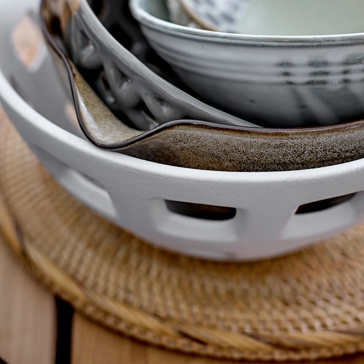 Le Foligno de Bloomingville présente un design sculptural qui se distingue du reste de la vaisselle. Ce magnifique bol est doté de trous creux qui le transforment en une superbe corbeille à fruits ou en un étonnant bol à pain dont le contenu est visible.