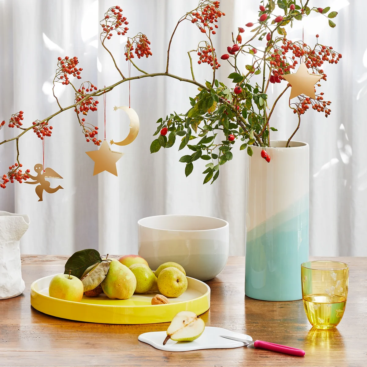 Le bol peut être utilisé à des fins décoratives et pour servir des en-cas, du muesli et d'autres plats. En plus du bol, un vase et un plateau du même style sont également disponibles.