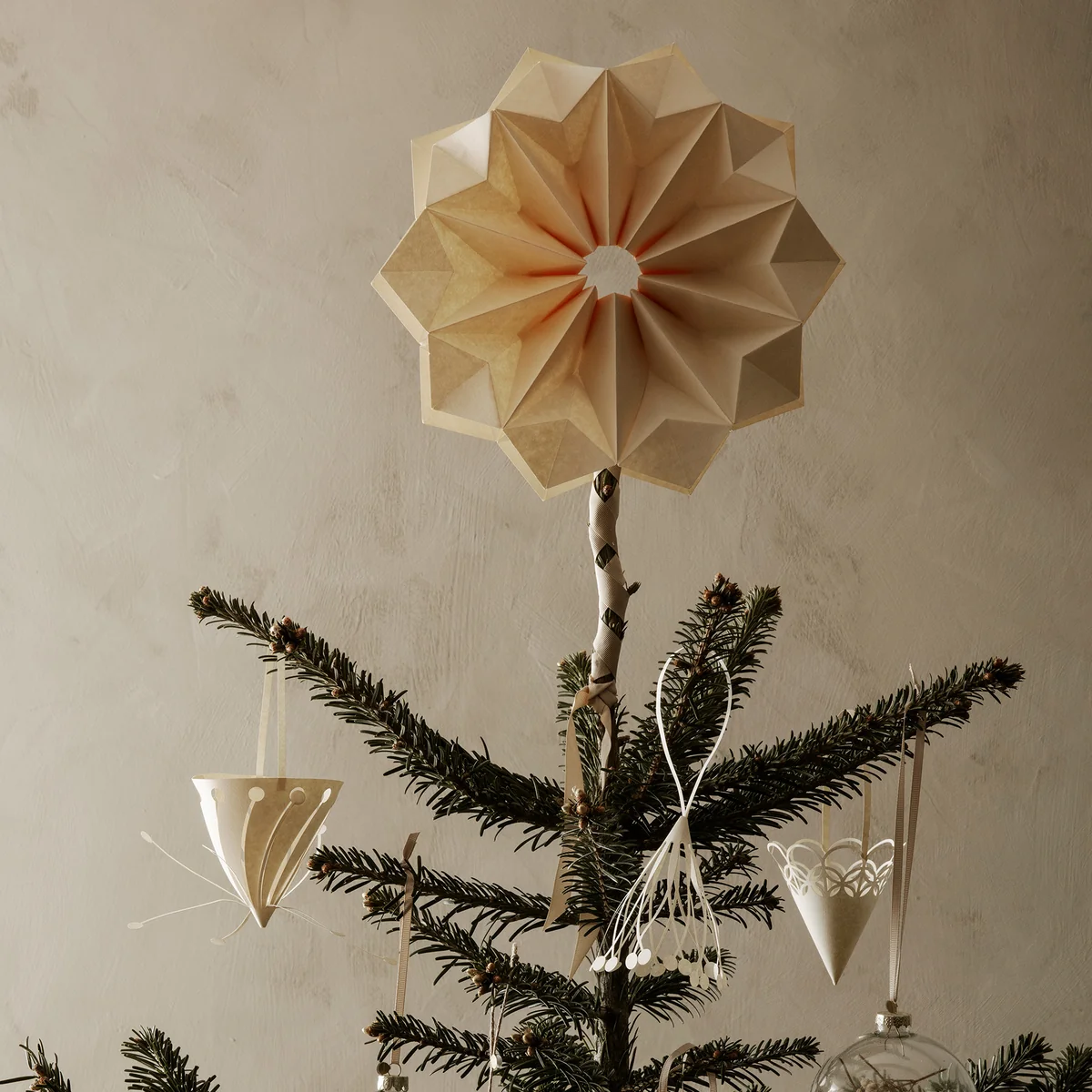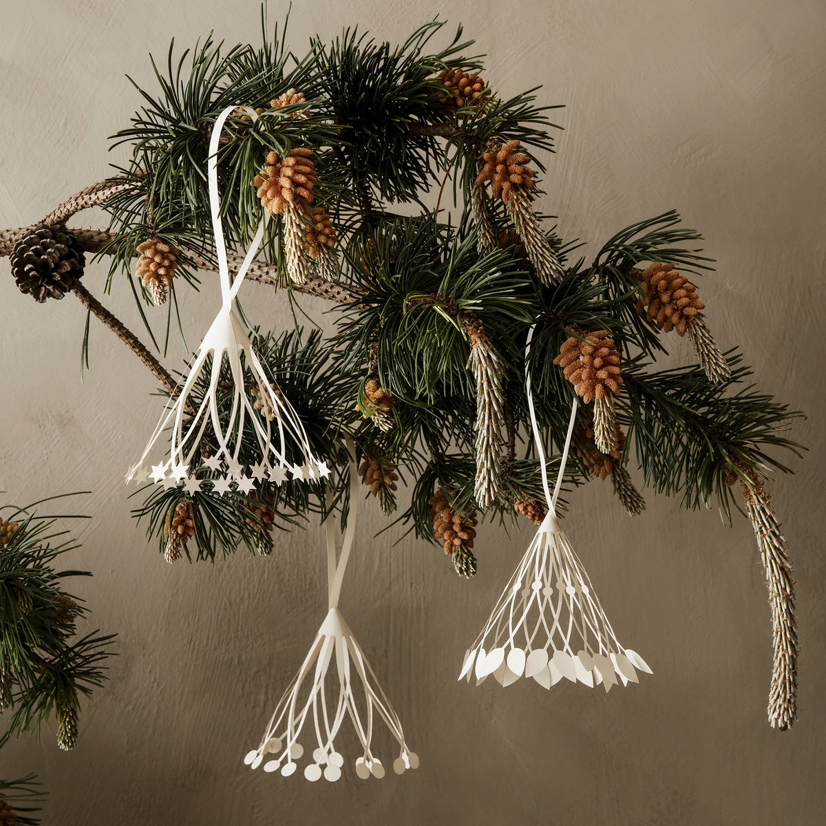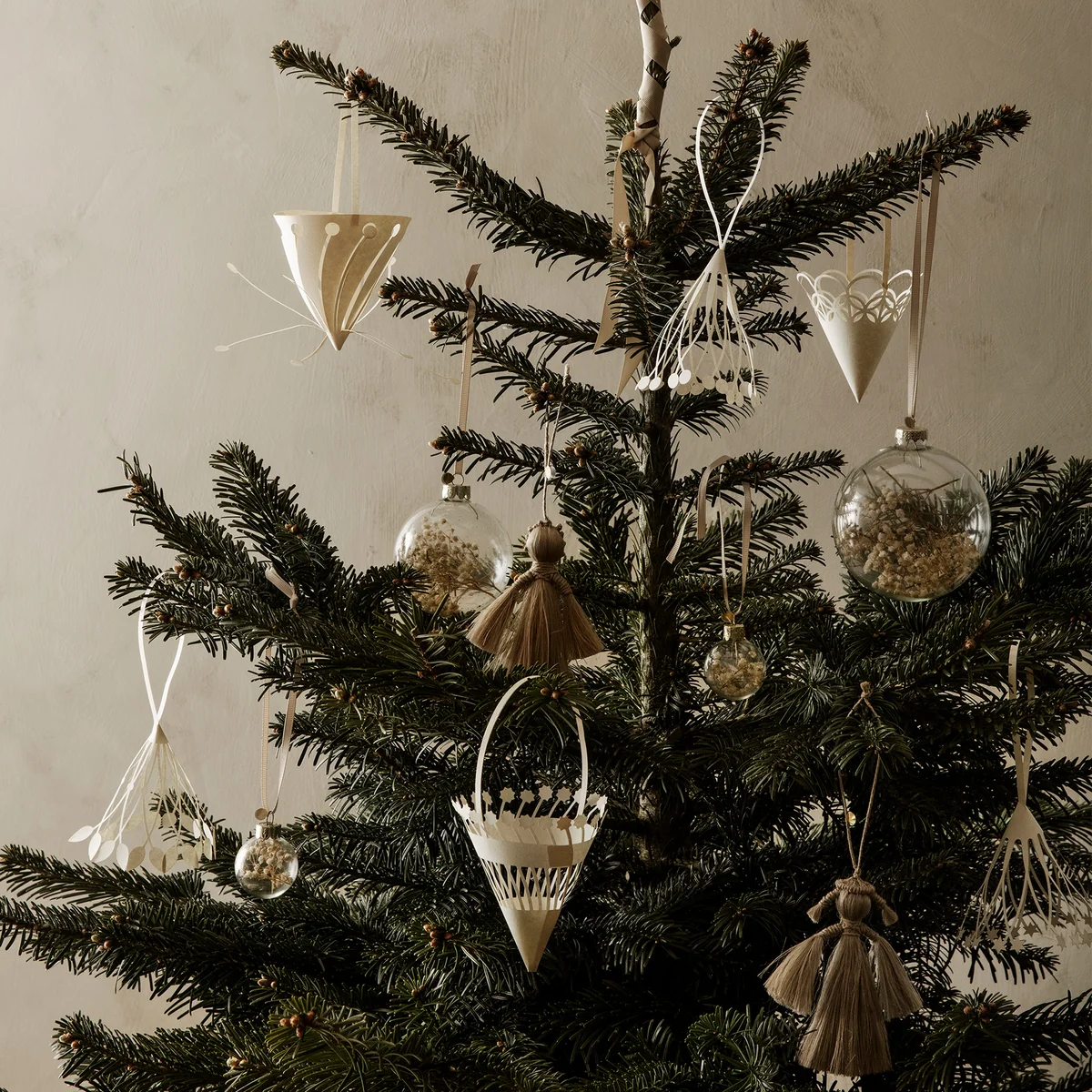 Les cintres en papier de Ferm Living, aux formes élégantes, constituent un point fort élégant et discret de la décoration de Noël. Les cônes ornementaux ont été conçus en collaboration avec l'artiste et architecte danoise Amanda Betz. Les pièces filigranes sont découpées au laser et pliées à la main. Ils sont fabriqués en papier certifié FSC™ et présentent une surface mate et lisse.