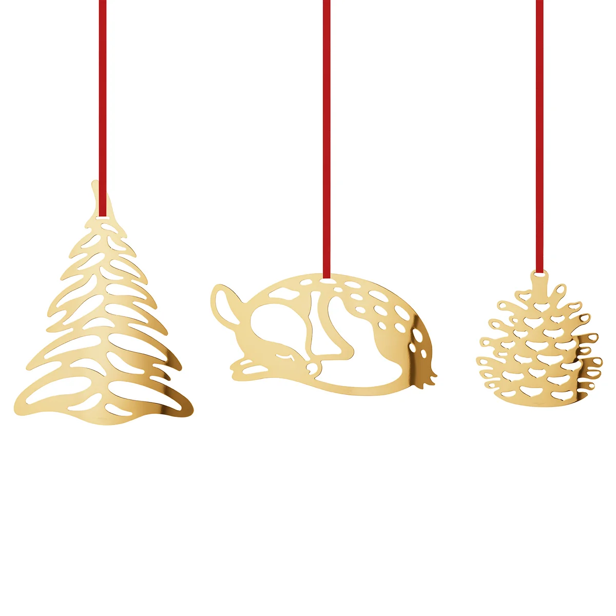 Le Large Christmas Ornament de Sanne Lund Traberg pour le fabricant danois Georg Jensen séduit par son élégance minimaliste. Le set de 3 pièces en acier inoxydable doré 18 carats comprend les favoris de la collection 2023. Les ornements peuvent être disposés individuellement dans l'intérieur ou combinés sur le sapin de Noël pour attirer le regard.