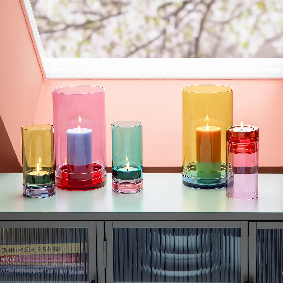 Il s'agit d'un photophore modulaire au design bicolore, adapté aux grandes bougies en bloc (jusqu'à Ø 11 cm). Les matériaux comprennent un cylindre en verre borosilicaté soufflé à la bouche et un socle en verre. Les dimensions sont de 28 cm de hauteur et de 15 cm de diamètre.
