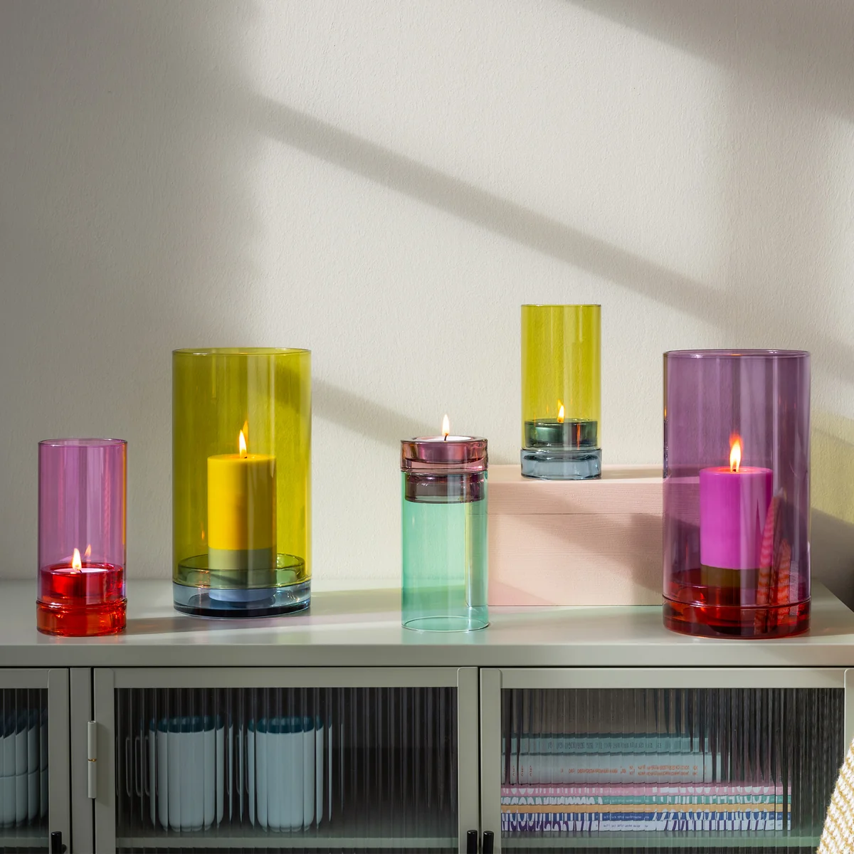 L'imposant photophore Lucius de Remember attire tous les regards. Son design est divisé en deux parties : Un cylindre droit protège la bougie des courants d'air, tandis qu'un socle de couleur contrastée apporte une touche supplémentaire. Ce photophore fait main se présente avec son format XL et son color-blocking et apporte, avec ou sans bougie bloc, une magnifique touche de couleur dans la maison ou sur la terrasse.