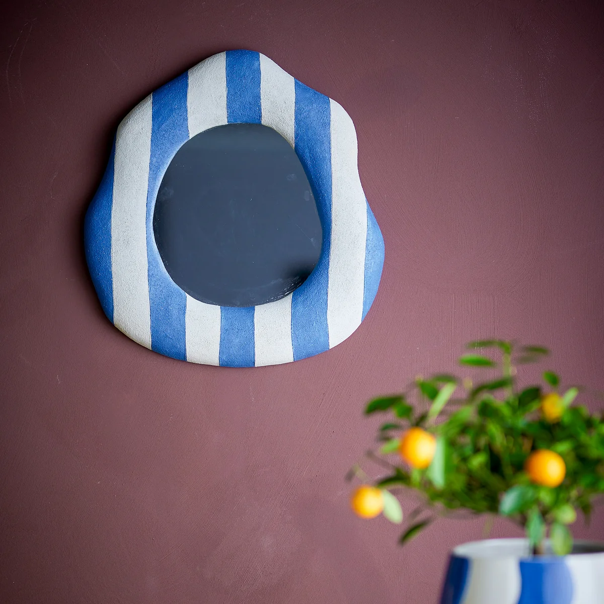 Le miroir mural Travis de Bloomingville est un objet design exceptionnel pour les pièces à vivre modernes. Avec son cadre rayé en polyrésine bleu et beige clair de forme organique, il apporte une touche de fraîcheur au mur - que ce soit dans l'entrée, le salon ou la chambre à coucher.