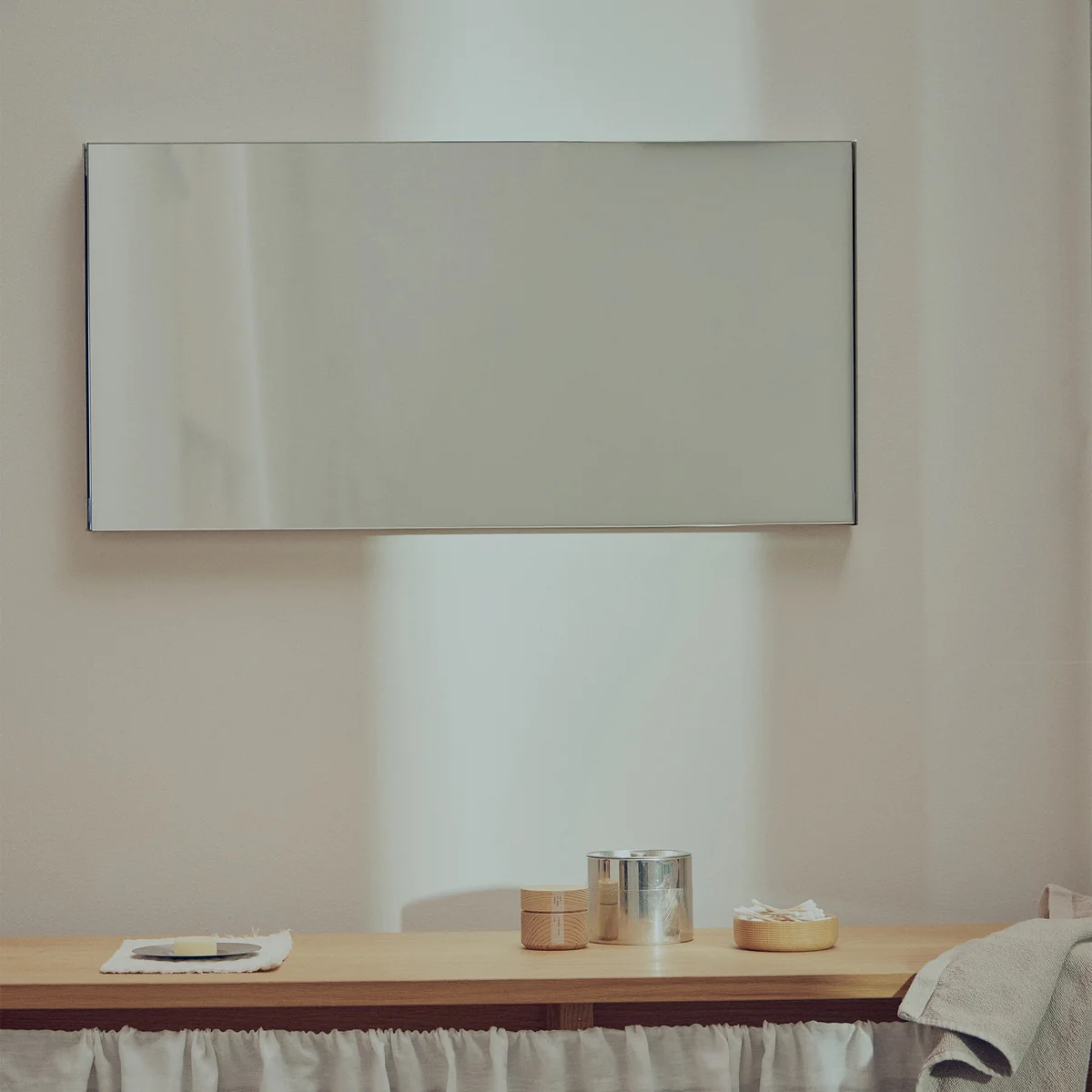 Des supports coudés à l'arrière assurent un maintien sûr tout en préservant l'effet ouvert et aéré du design. Les bords avant légèrement arrondis soulignent la qualité artisanale et confèrent aux profilés en acier brut une surface agréablement lisse et tactile. Le miroir peut être monté horizontalement ou verticalement selon la configuration de la pièce et offre ainsi une flexibilité maximale en matière d'aménagement.