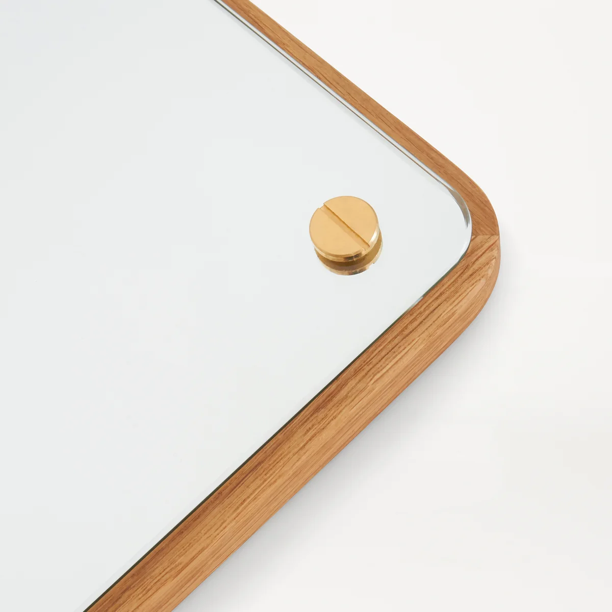 Le miroir rectangulaire est monté sur une plaque de chêne massif au mur et maintenu en place par des vis apparentes, un hommage design aux années 1950.