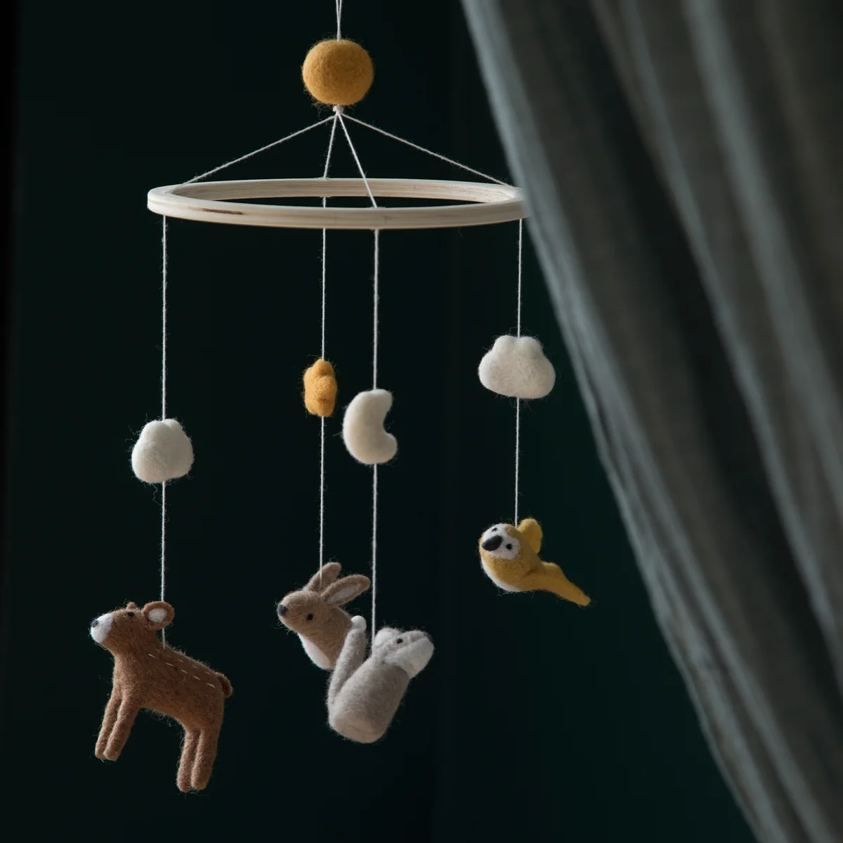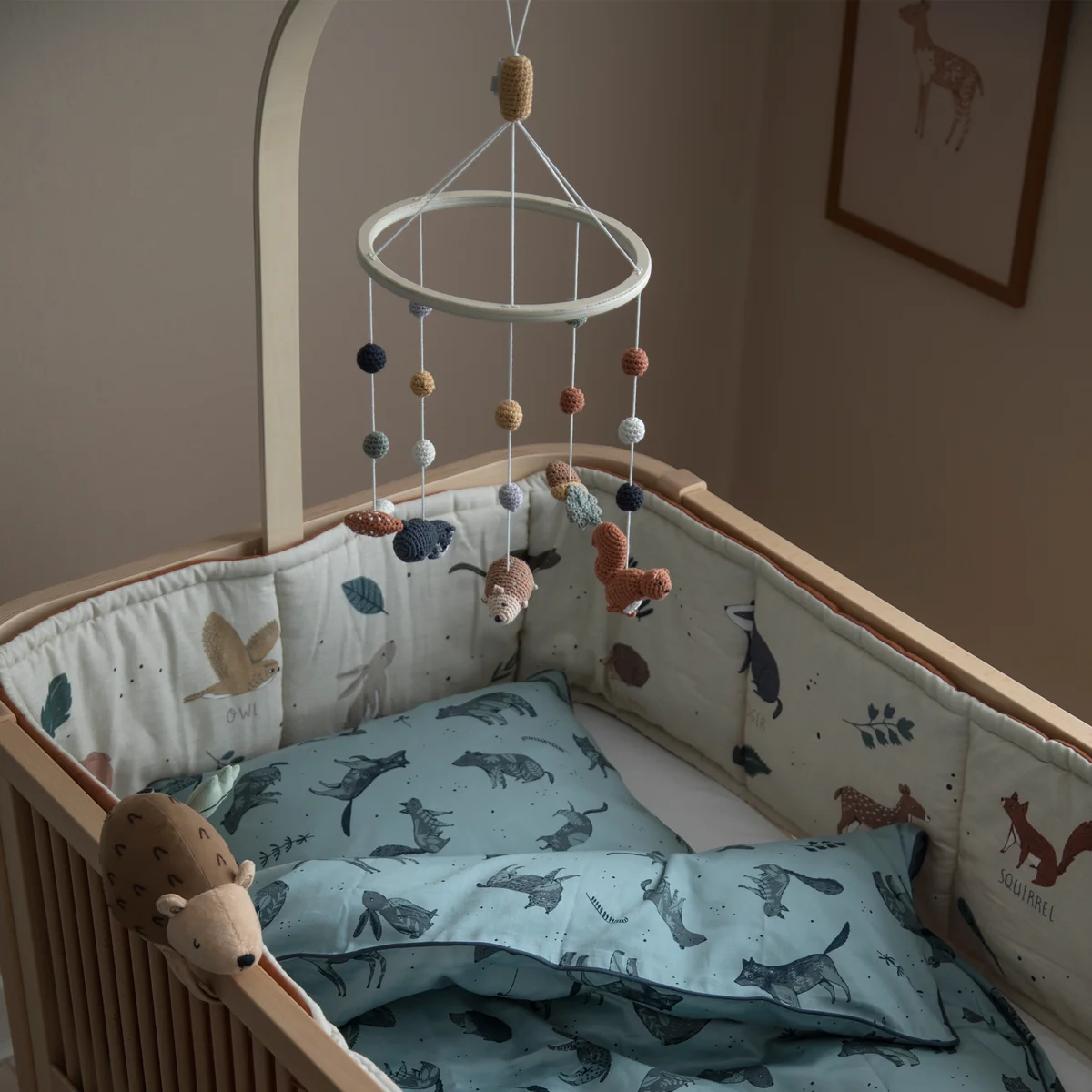 Le mobile de la Nightfall de Sebra se compose d'un anneau en bois auquel sont suspendus des animaux et des personnages de la forêt fabriqués à la main. Le mobile peut être accroché dans la chambre d'enfant au-dessus du lit du bébé, d'un berceau ou d'une table à langer. Il attire l'attention de l'enfant, stimule ses sens et le calme.