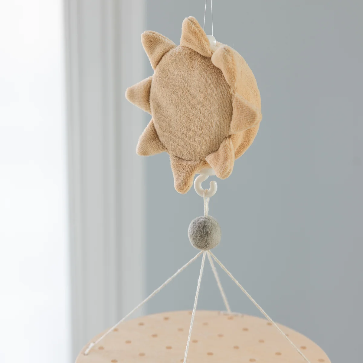 Le miroir intégré au centre invite votre bébé à découvrir son reflet et stimule de manière ludique la perception de soi. Le mobile fonctionne mécaniquement - sans piles : Il suffit de tirer le bouton en forme de soleil et le doux jeu de la musique et des mouvements commence. Avec ses couleurs et ses formes contrastées, il favorise le développement visuel et acoustique de votre enfant tout en créant une atmosphère calme et sécurisante dans la chambre d'enfant.