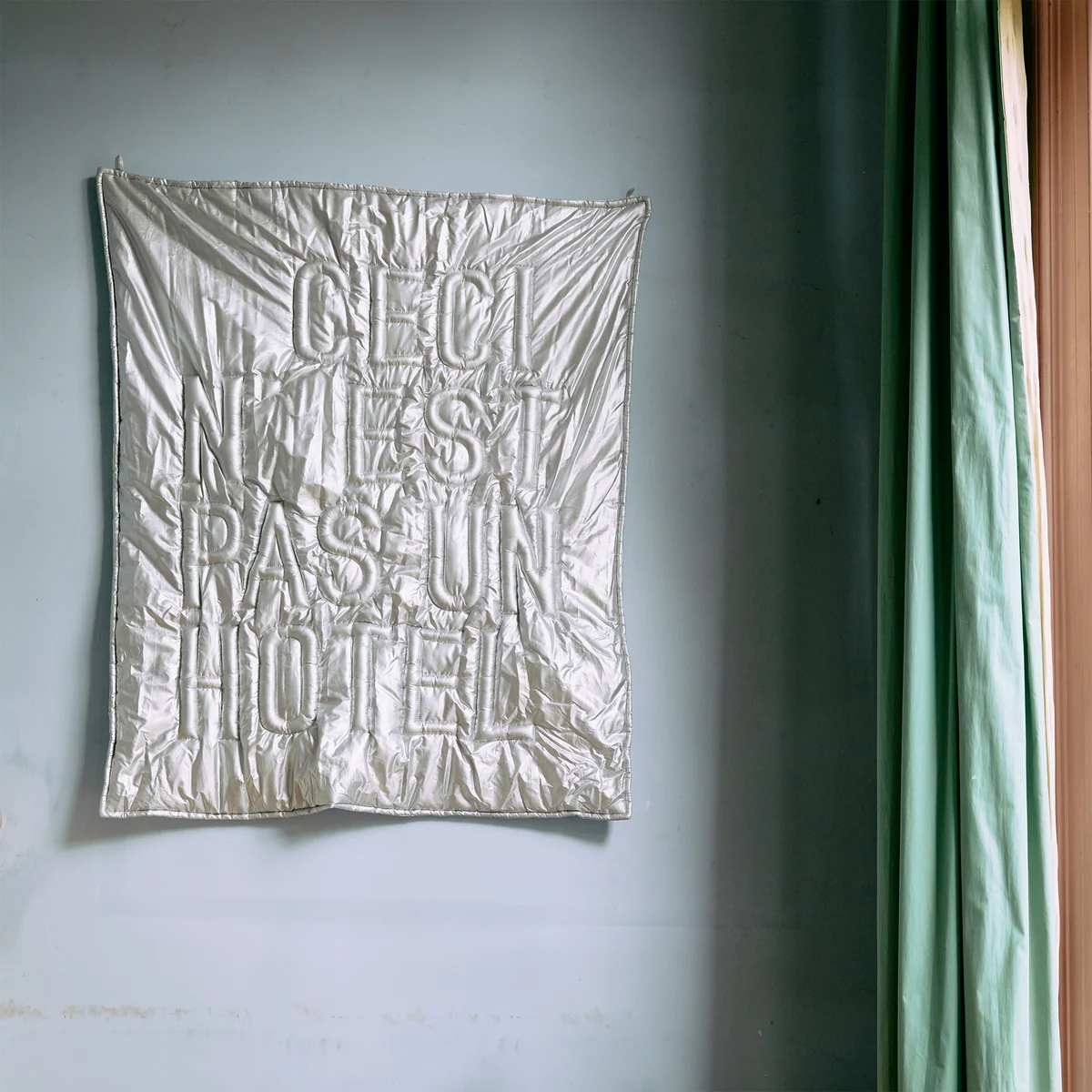 - Avec une citation brodée " Ceci n’est pas un hôtel " de Maaike Koster