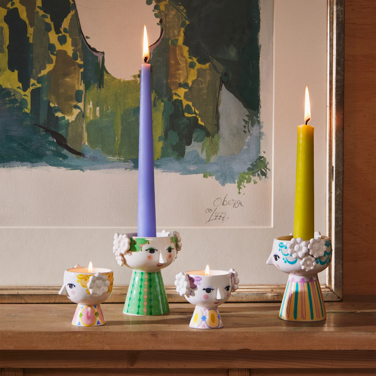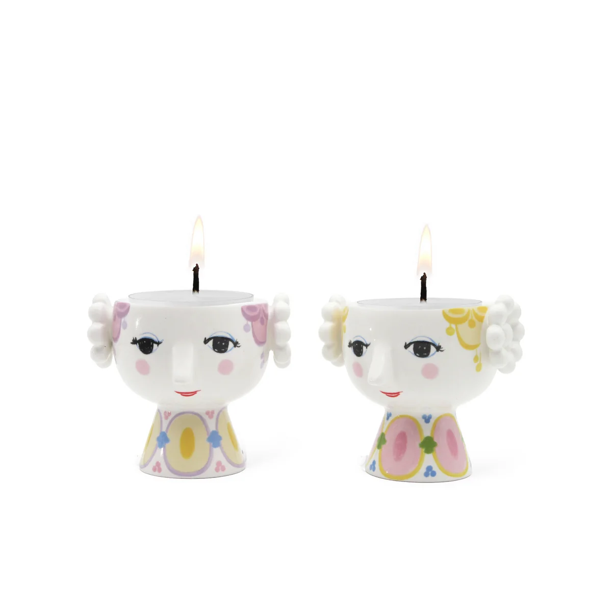 Le Eva Le porte-bougie à réchaud dans un charmant ton lavande est orné de détails bizarres, dont des cheveux rouges et une robe colorée à pois roses et verts, complétés par des rangées de rayures rouges.