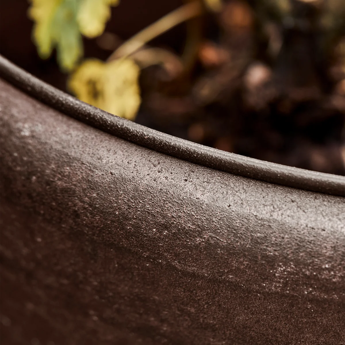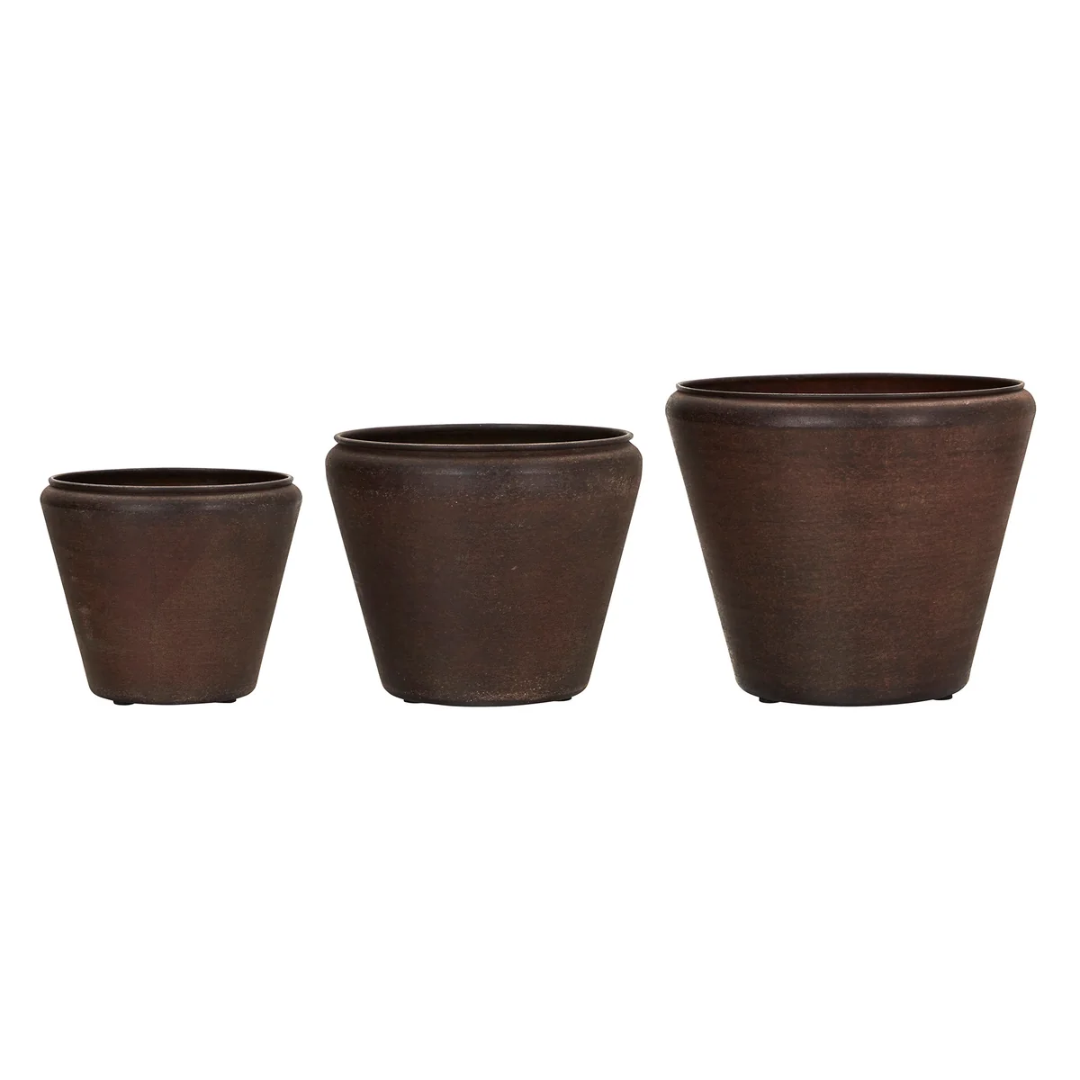 Ce set de trois pots de fleurs confère aux terrasses et aux balcons un look moderne et élégant. La forme conique et la surface mate de couleur marron antique mettent en valeur les plantes et les fleurs avec style. Fabriqué en acier recyclé, chaque pot combine durabilité et texture unique. Les trous de drainage intégrés avec bouchons garantissent une utilisation facile et une grande polyvalence.