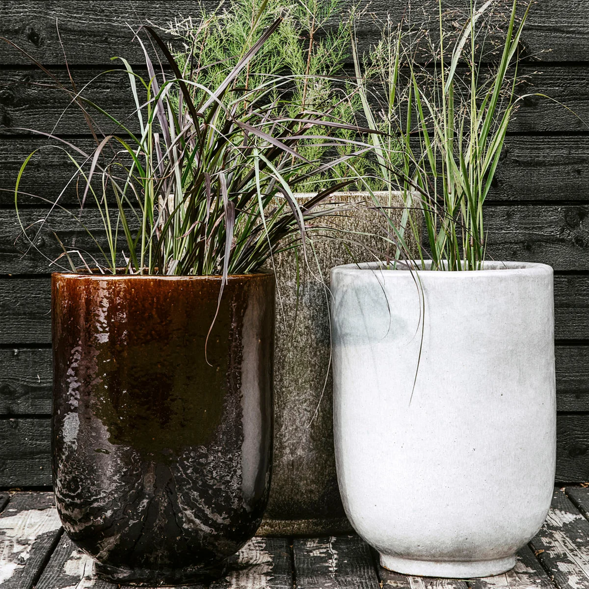 Les pots sont fabriqués en céramique et recouverts d'un émail décoratif unique qui fait de chaque pot une pièce unique. Les pots peuvent être mis en scène avec des plantes qui peuvent être adaptées à volonté au style d'aménagement, conférant ainsi à la terrasse une personnalité particulière. Les pots de fleurs ont un trou dans le fond et sont résistants au gel jusqu'à -20 degrés.