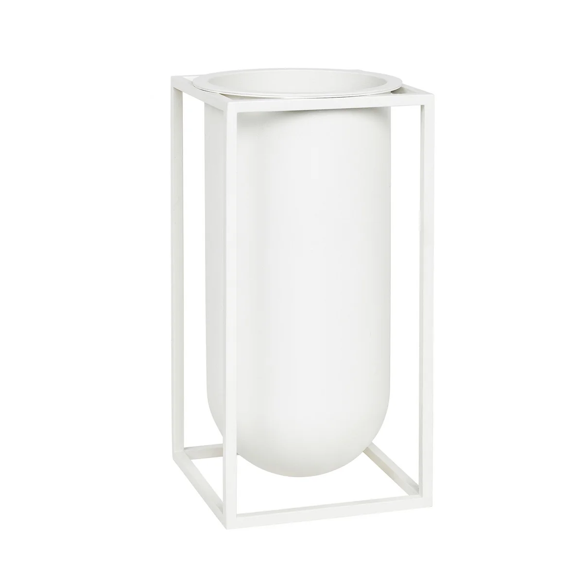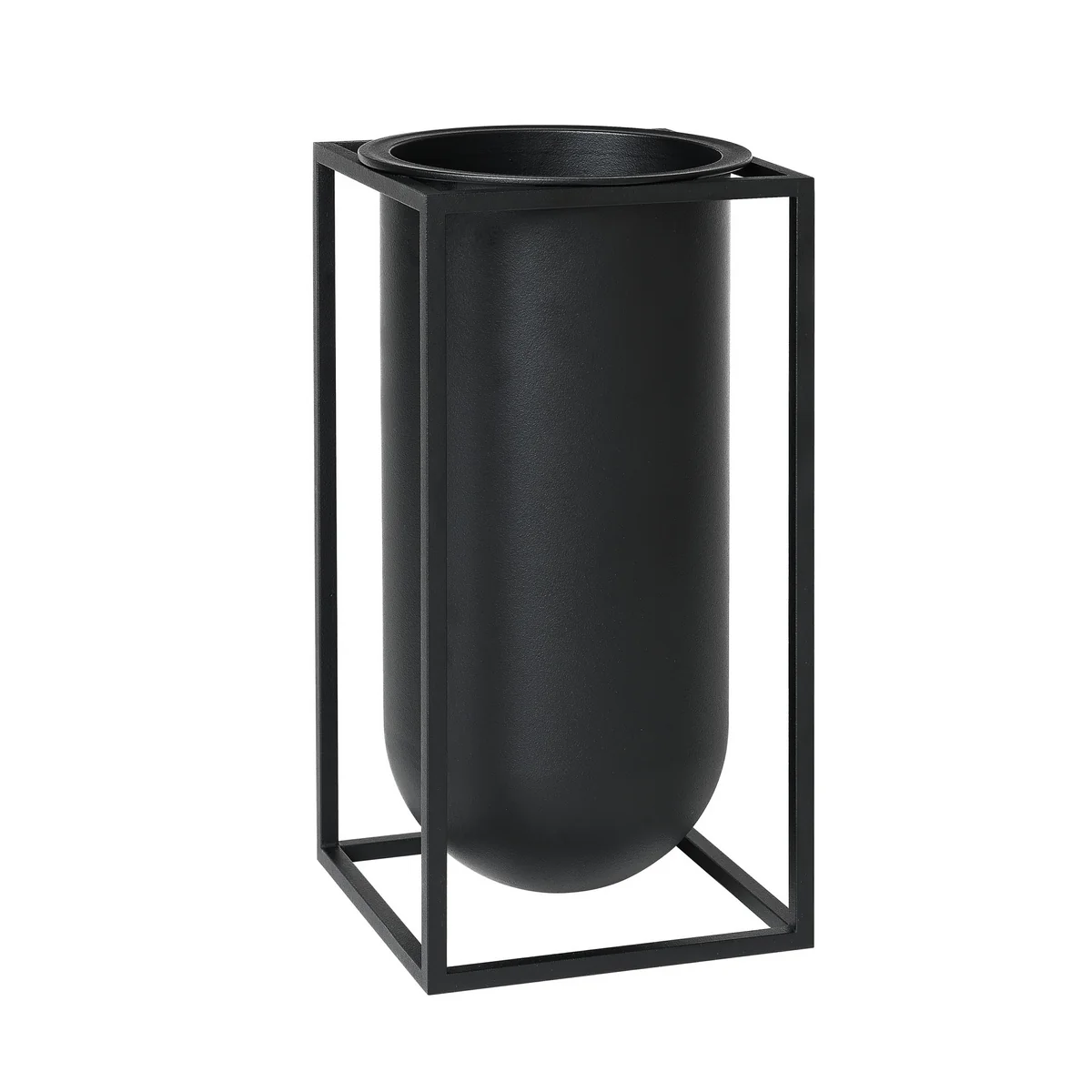 Des lignes minimalistes et épurées caractérisent la série Kubus, qui se retrouvent également dans le vase. La combinaison du cadre en acier thermo-laqué et de la forme organique de l'élément du vase, crée un vase symétrique, sculptural et élégant qui peut être incorporé comme une extension naturelle des conceptions de Mogens Lassen.