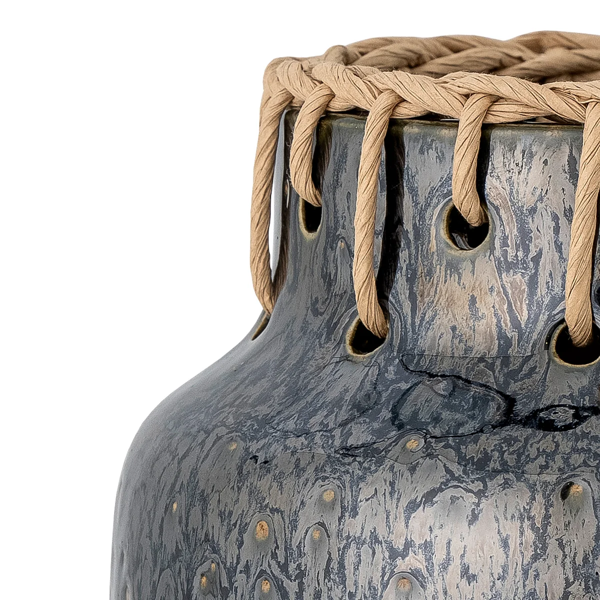 Le vase Janel de Bloomingville est un vase en céramique émaillée réactive qui met en valeur ses couleurs de manière particulièrement esthétique et vivante. Sur le dessus du vase se trouvent de fins détails en rotin qui sont lacés par des trous dans la céramique. Le vase présente un aspect pointillé avec de belles nuances. L'intérieur du vase est vitré et peut donc être rempli d'eau sans problème. En le combinant avec d'autres objets décoratifs, il est possible de créer un intérieur vivant et tropical.