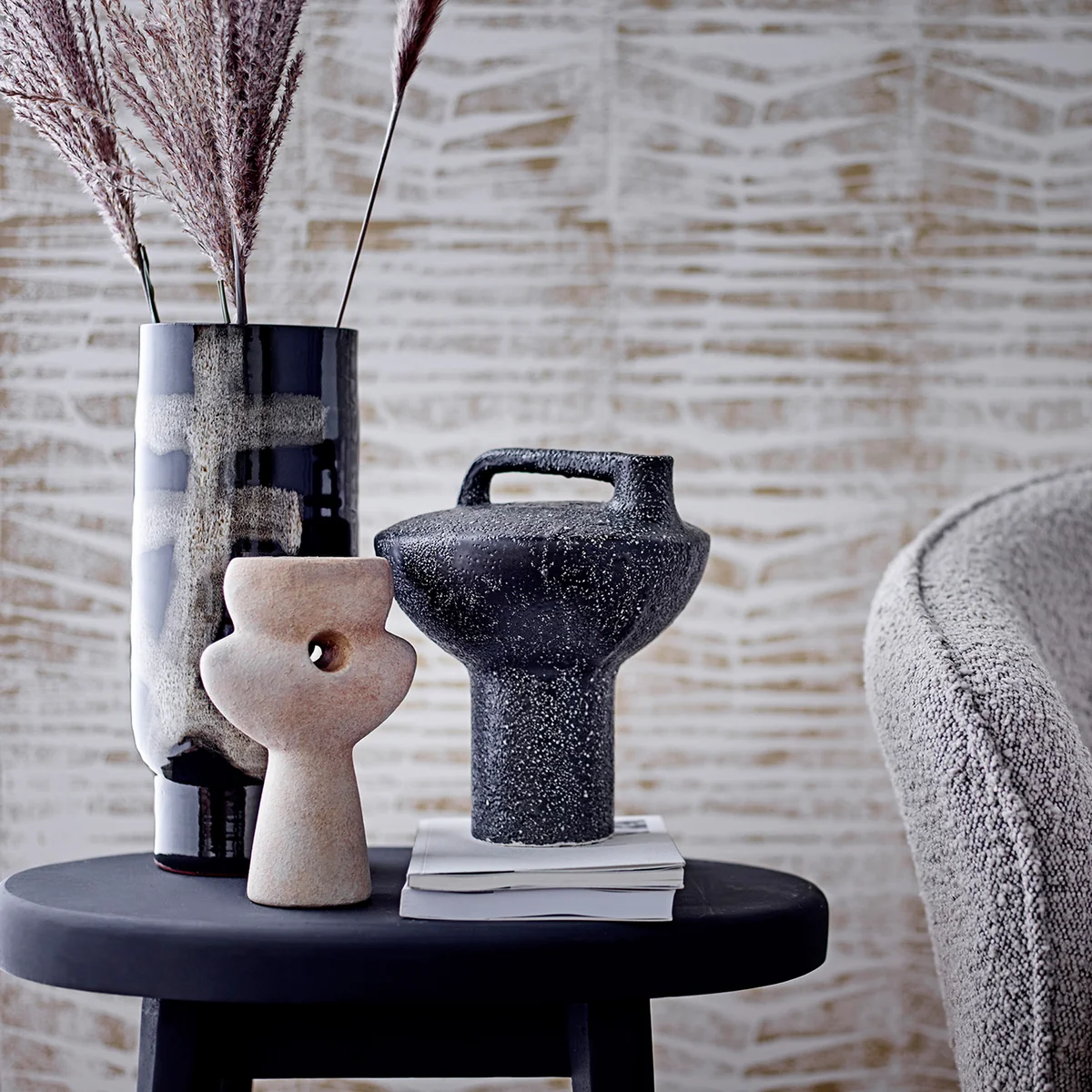 Le vase Vefa de Bloomingville est un vase décoratif qui est assez haut pour être posé sur le sol et assez bas pour être posé également sur la table, la commode, l'étagère ou le rebord de la fenêtre. Le vase est en terre cuite avec un motif rayé noir et blanc.