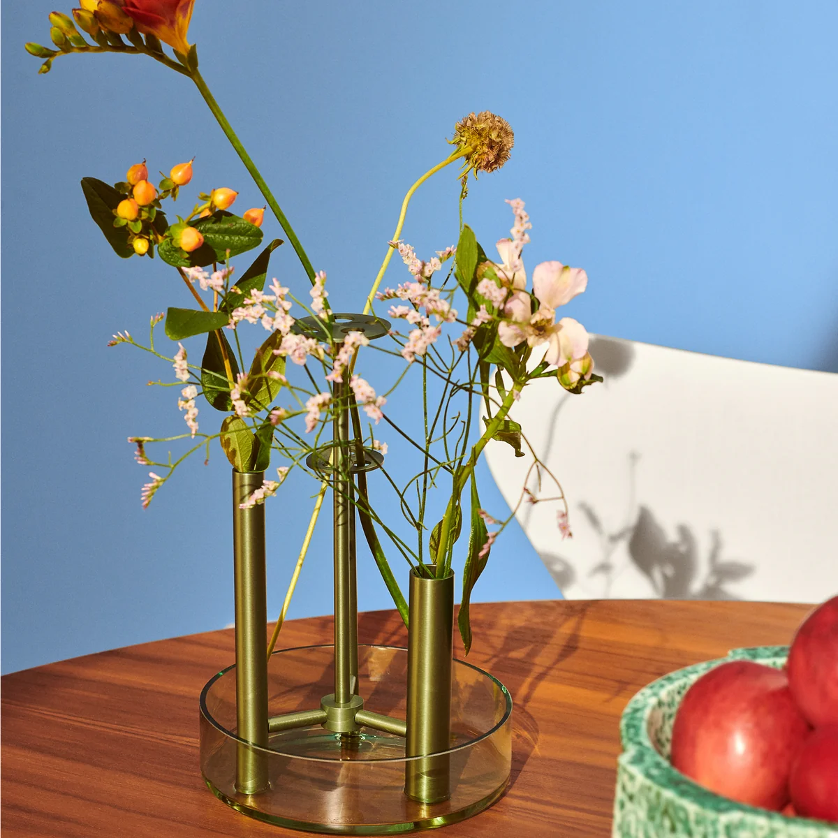 La coupe à eau du Ikeru vase est en verre vert forêt, les tubes et le support sont en aluminium. Le Ikeru Le vase Low est également disponible en version haute.