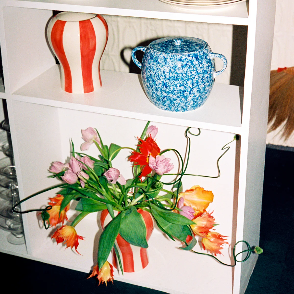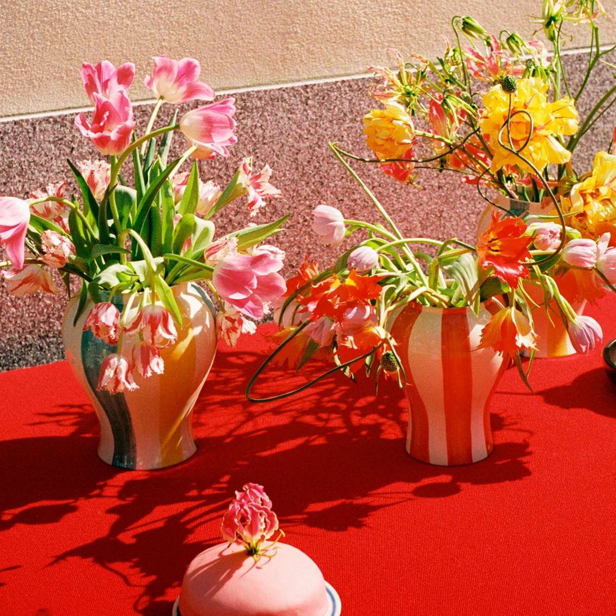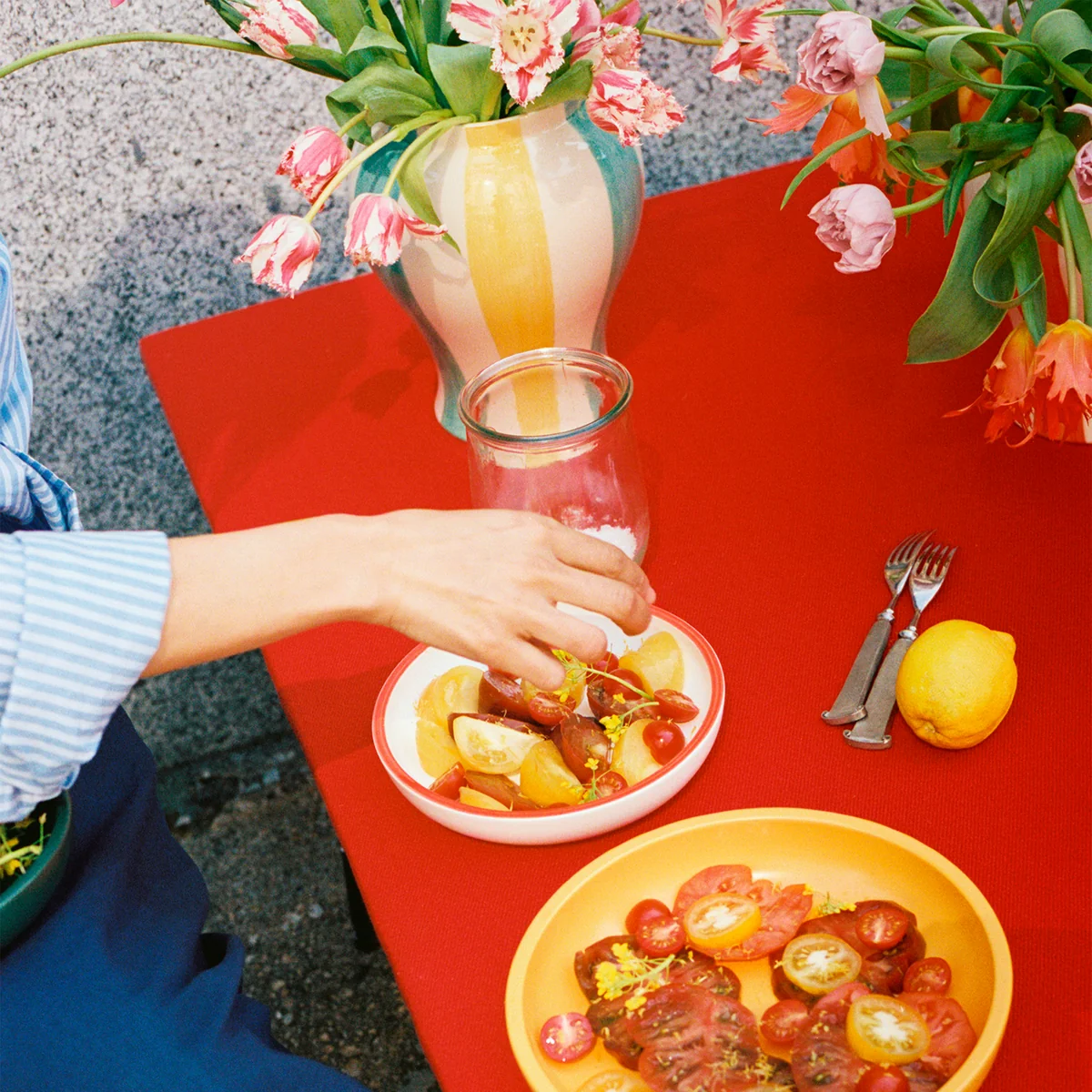 Le modèle Sobremesa vase de l'artiste Laila Gohar en coopération avec le label danois HAY célèbre la convivialité avec les amis et la famille. Il fait partie de la Sobremesa série qui, de manière raffinée, rehausse en un clin d'œil l'atmosphère des repas et confère une touche décorative à la table dressée. Le vase est fabriqué en faïence et peint à la main avec un motif à rayures multicolores. Comme il s'agit d'un article fabriqué à la main, chaque vase est unique. Sobremesa peut être utilisé soit pour des bouquets de fleurs, des branches fleuries ou même pour ranger de manière décorative des ustensiles de cuisine.