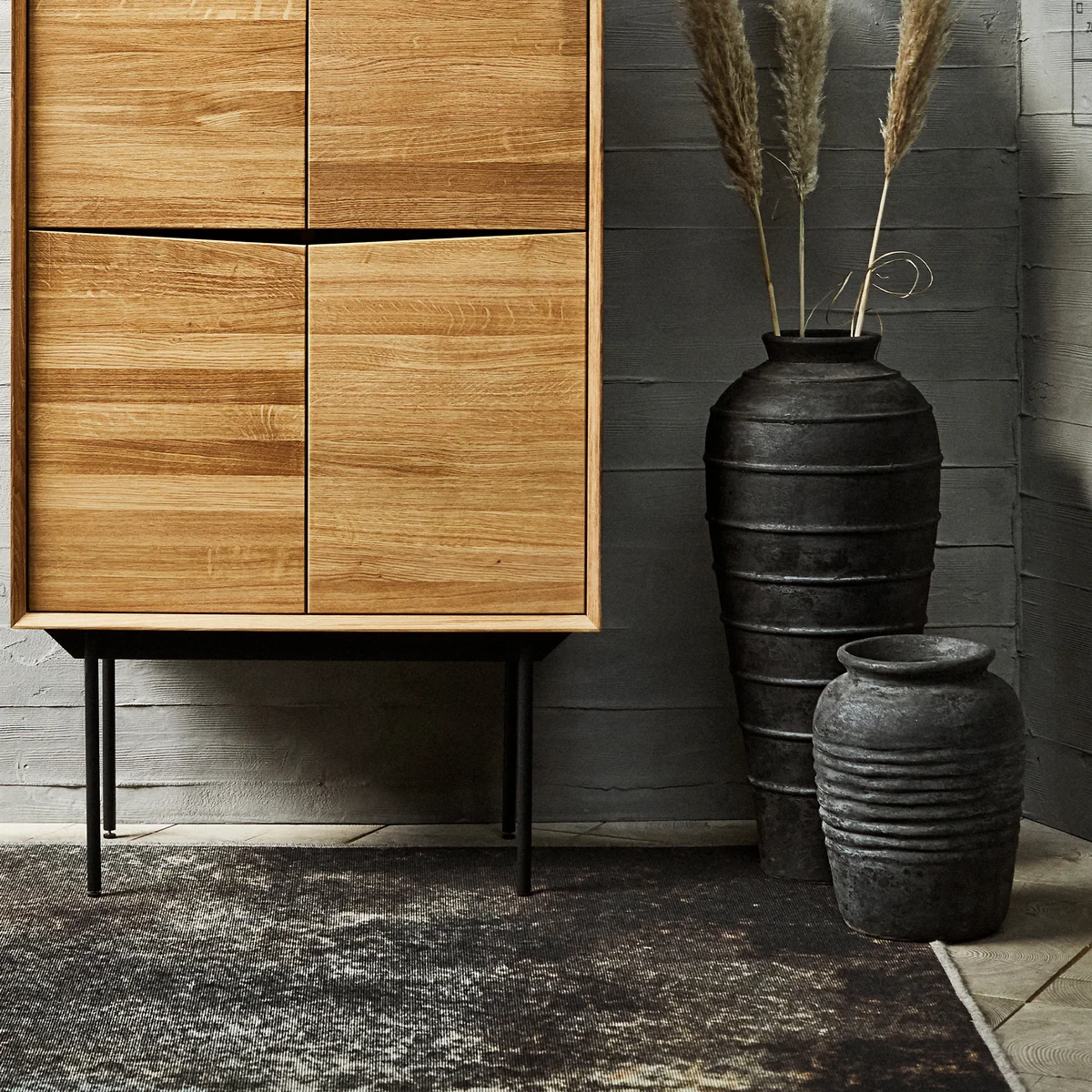 Le Melancholia cruche de la maison danoise Muubs est polie à la main à partir de terre cuite. L'application d'une couche de peinture noire, qui est ensuite poncée, permet d'obtenir une surface unique. Pour finir, la cruche est recouverte d'une fine couche de peinture grise, également poncée, et d'une dernière couche de vernis.