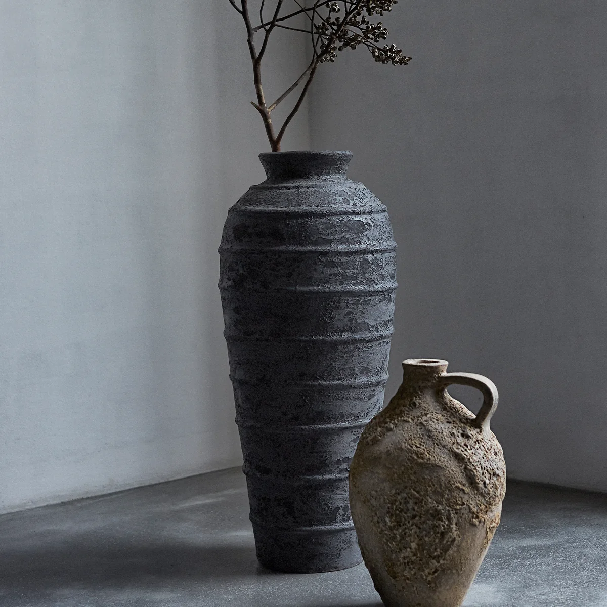 Le Melancholia Jarre de Muubs est disponible en différentes tailles. Elle peut parfaitement être décorée de branches ou de fleurs séchées. Veuillez noter que le pichet n'est pas étanche.