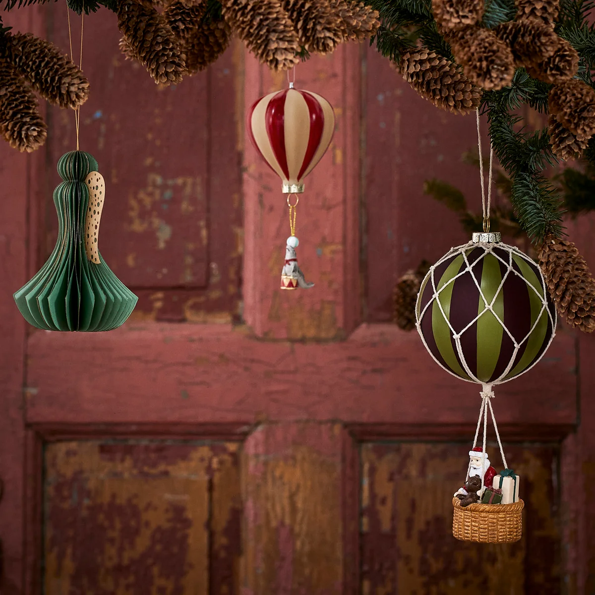 L'ornement Hettie de Bloomingville représente une montgolfière fantaisiste avec un passager en tenue de fête dans la nacelle. Suspendu à un fil doré, il devient un charmant point d'orgue dans le sapin de Noël et apporte une note ludique à la décoration festive.