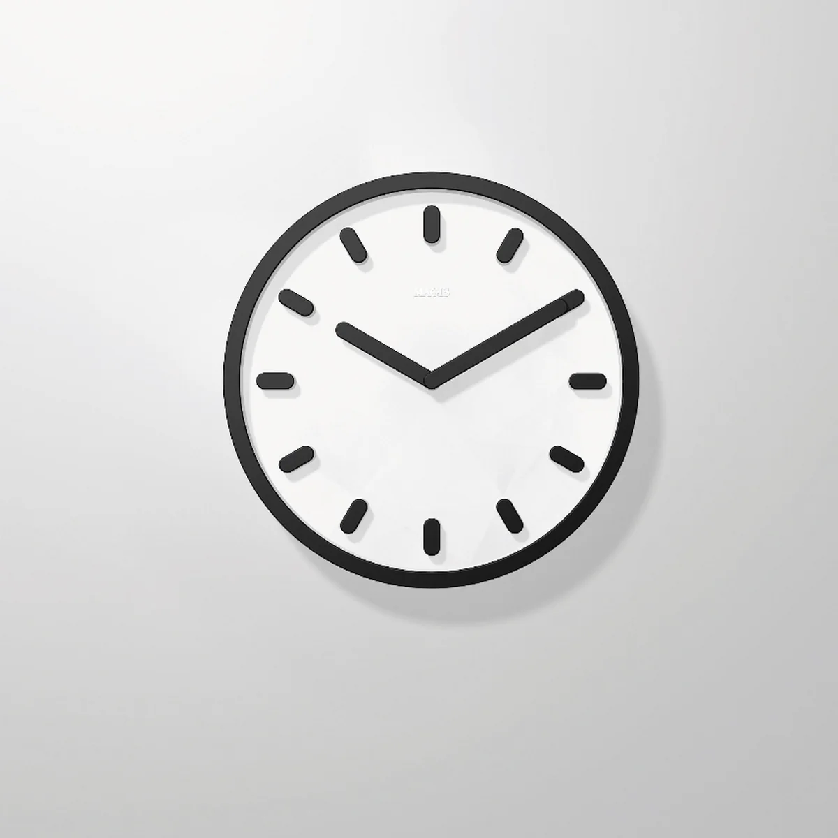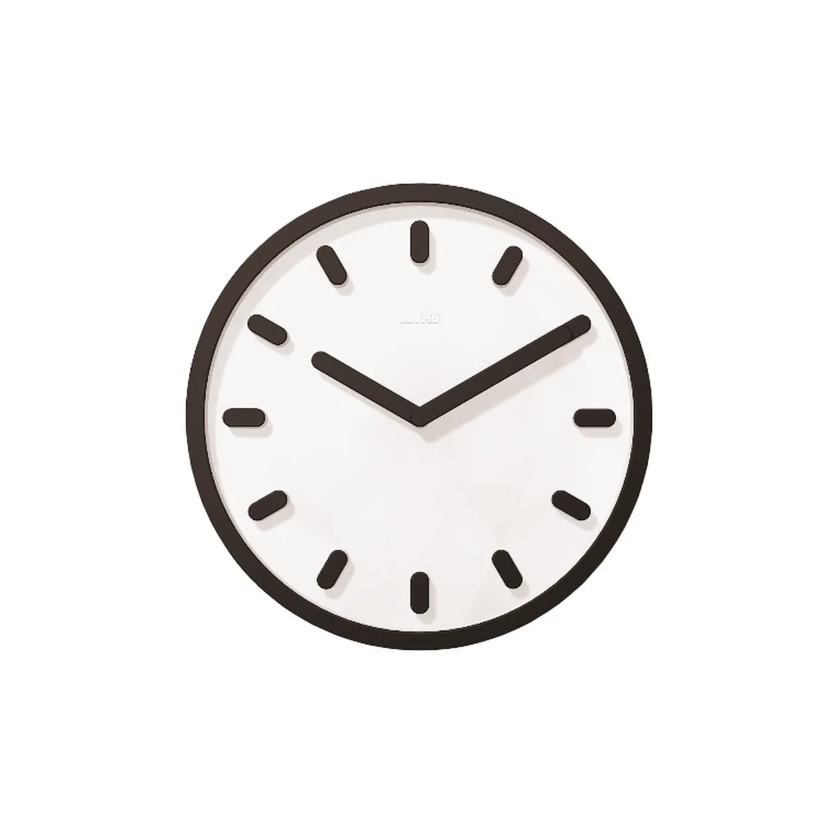 L'horloge murale alimentée par batterie est fabriquée en plastique ABS par méthode d'injection. Il est disponible en quatre versions : aiguilles et cadre en brun, noir, gris et orange (le cadran est toujours blanc).