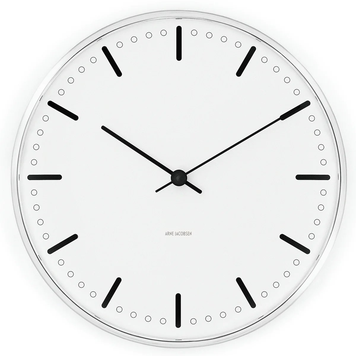 L'horloge murale de l'hôtel de ville a été conçue par Arne Jacobsen en 1956 pour l'hôtel de ville de Rødovre. Elle séduit par sa simplicité, car le cadran abstrait indique le nombre d'heures par des traits et les minutes par des points.