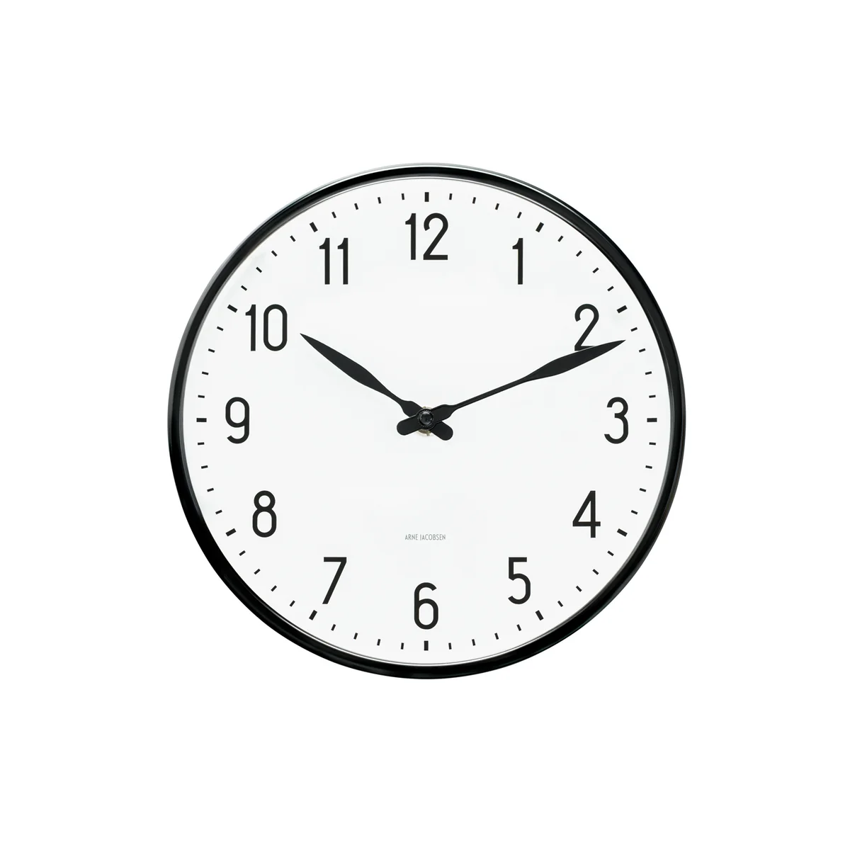 La Station qu'Arne Jacobsen avait créée en 1941 pour le fabricant d'appareillage électrique LK se distingue des autres horloges murales AJ de Rosendahl par ses chiffres arabes qui se démarquent nettement du cadran et par les aiguilles caractéristiques en noir et blanc qui marquent le temps qui passe.