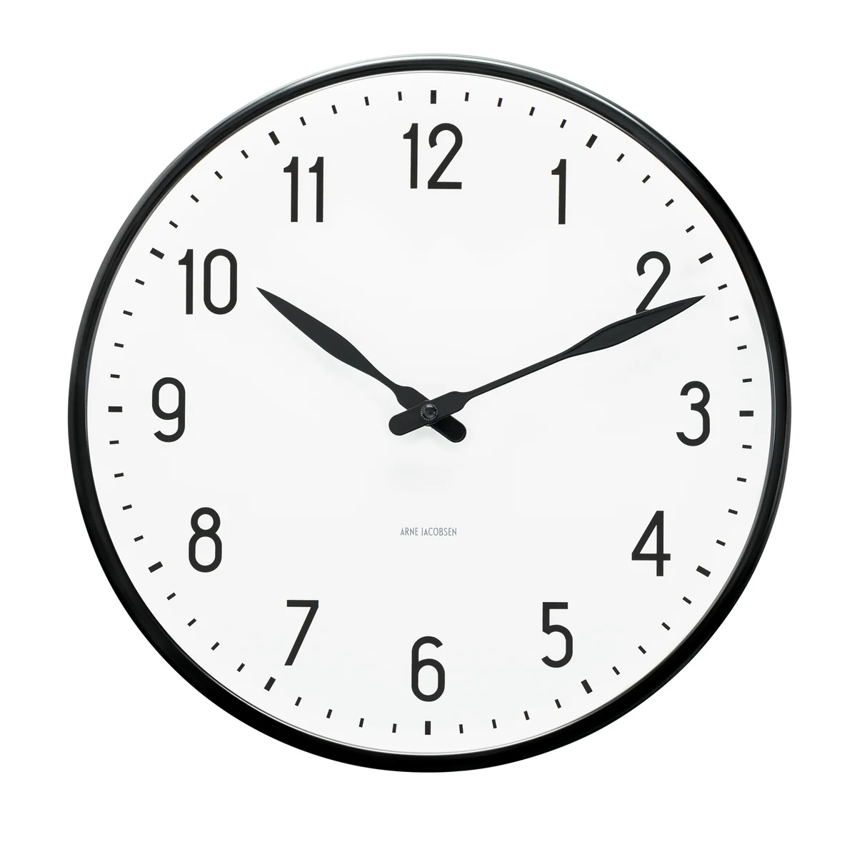 La Station qu'Arne Jacobsen avait créée en 1941 pour le fabricant d'appareillage électrique LK se distingue des autres horloges murales AJ de Rosendahl par ses chiffres arabes qui se démarquent nettement du cadran et par les aiguilles caractéristiques en noir et blanc qui marquent le temps qui passe.