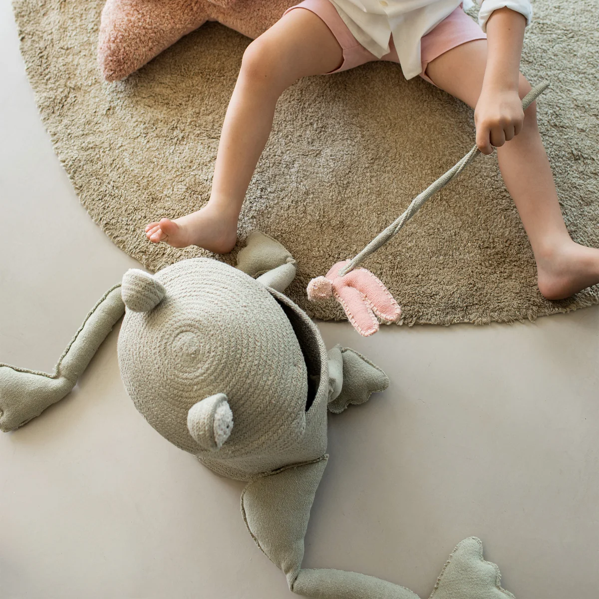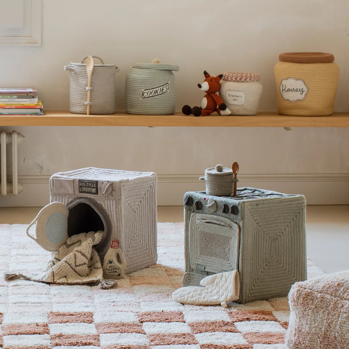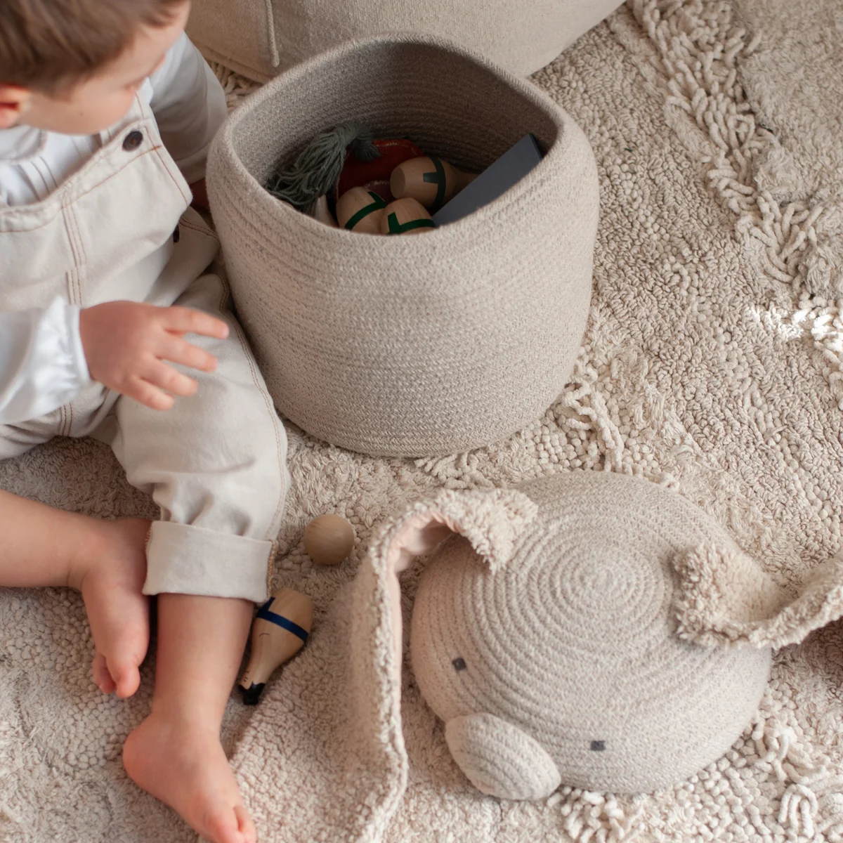 Le panier de jeu et de rangement de la maison espagnole Lorena Canals séduit par son aspect féerique et son espace de rangement évasé ! Le panier est fabriqué à partir de ficelles tressées à la main. Les ficelles sont composées de bouteilles PET recyclées et de fibres de coton. Comme il s'agit d'un article fabriqué à la main, il peut y avoir de légères différences entre les produits.