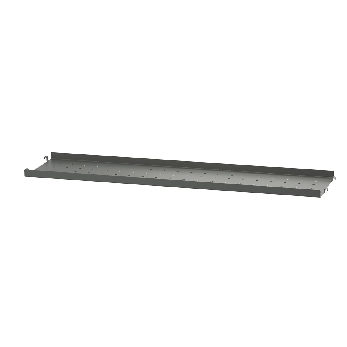 Les étagères métalliques sont particulièrement pratiques lorsque le système d'étagères String se transforme en portemanteau mural dans le couloir. Les chapeaux et les écharpes peuvent être placés sur les étagères, tandis que le fond perforé permet d'accrocher des crochets et des barres pour suspendre des vestes, des parapluies, des sacs, des manteaux et des cintres. Un porte-chaussures en métal perforé est également disponible pour compléter la garde-robe.