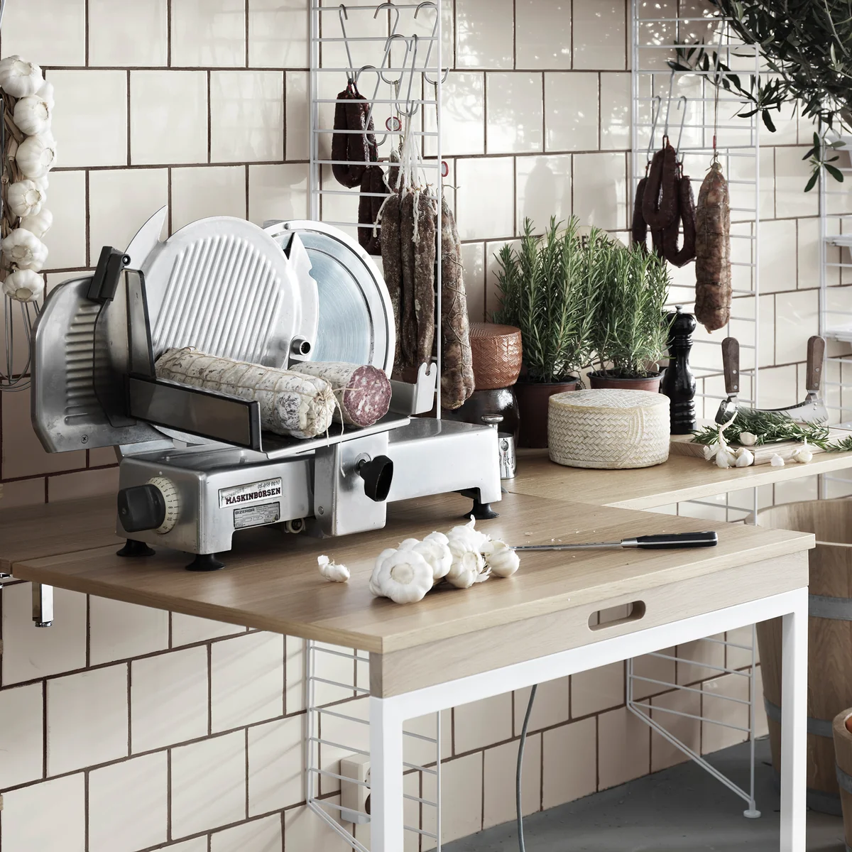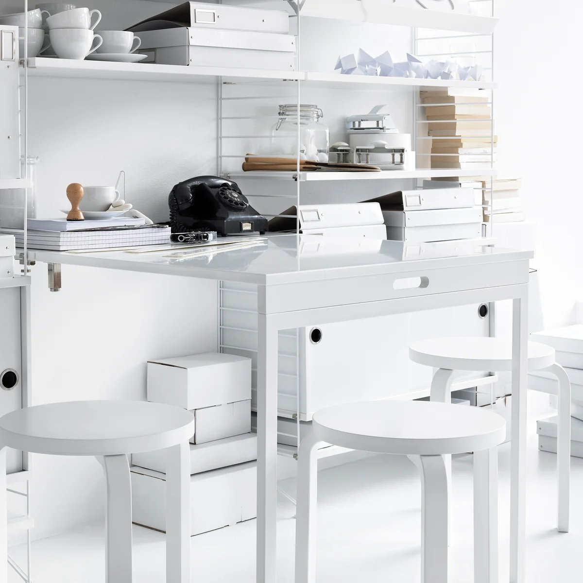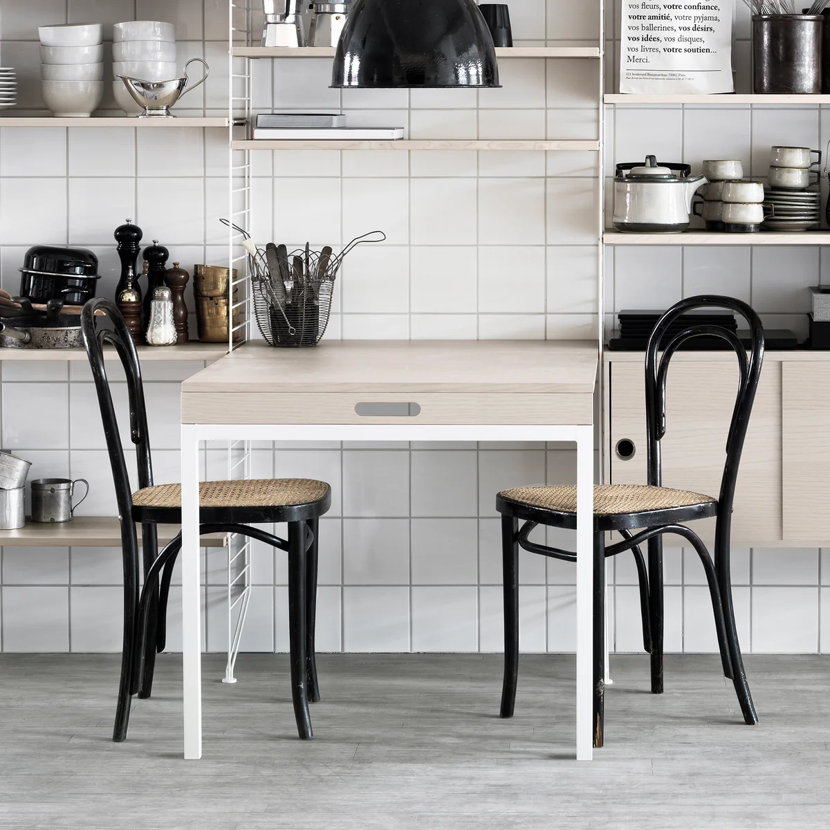 Avec la table pliante de String , le système d'étagères se transforme en un clin d'œil en table à manger pliable. Elle s'intègre parfaitement dans la cuisine, le salon ou la salle à manger et convient parfaitement aux petits appartements et aux pièces où l'espace est limité.