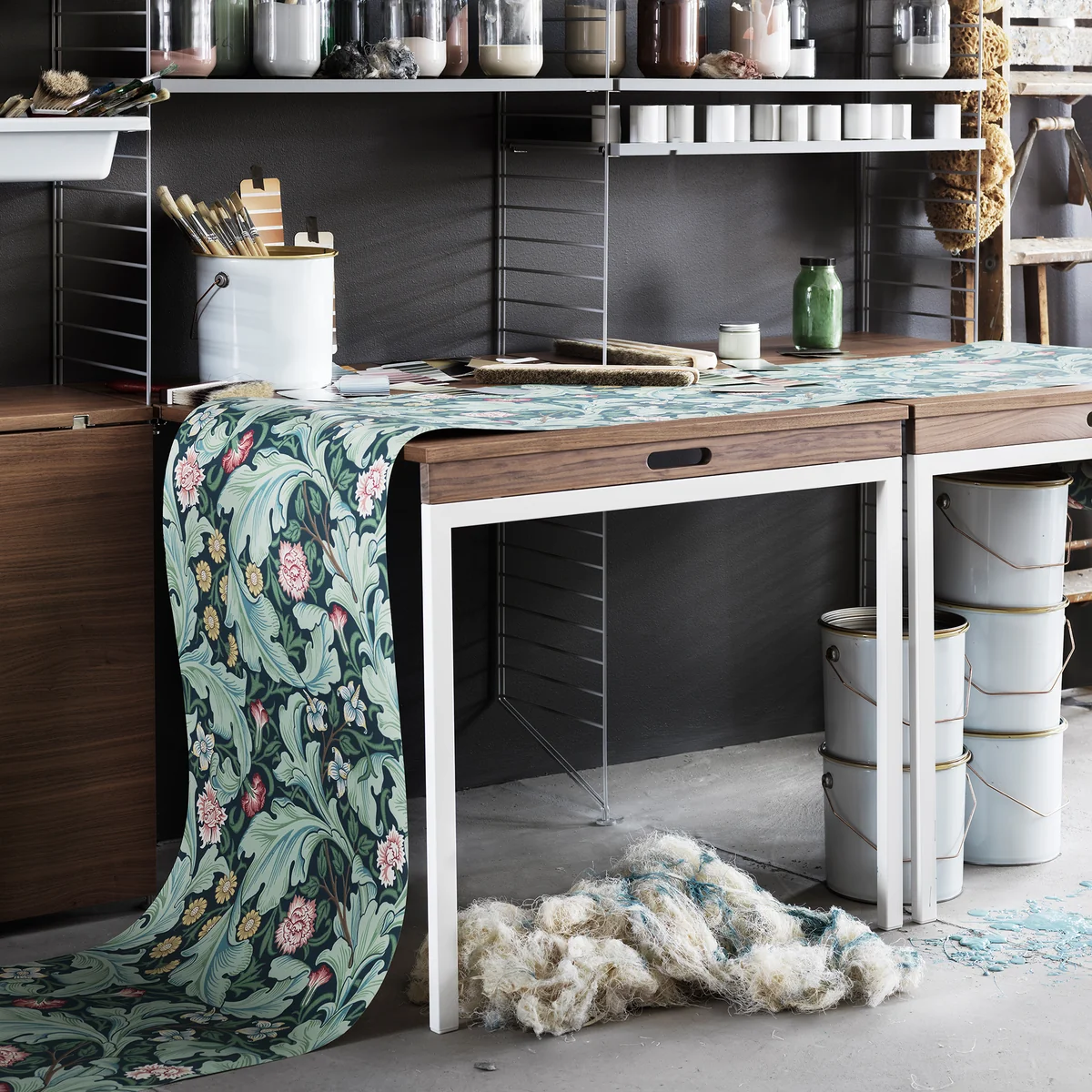La table pliante de String est fabriquée à partir de différentes essences de bois et est disponible en plusieurs couleurs. Le piètement est en acier. Elle est compatible avec toutes les échelles murales et de sol d'une profondeur de 30 cm.