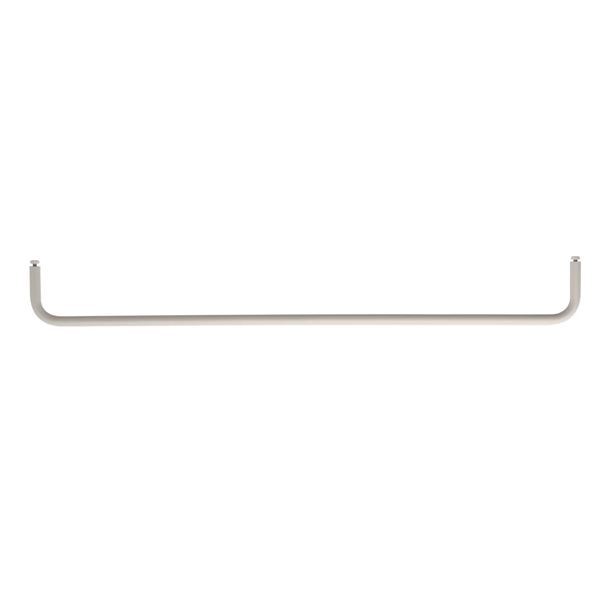 La barre s'accroche simplement dans le métal perforé des étagères. Elle est fabriquée en métal et est disponible en différentes couleurs et longueurs.