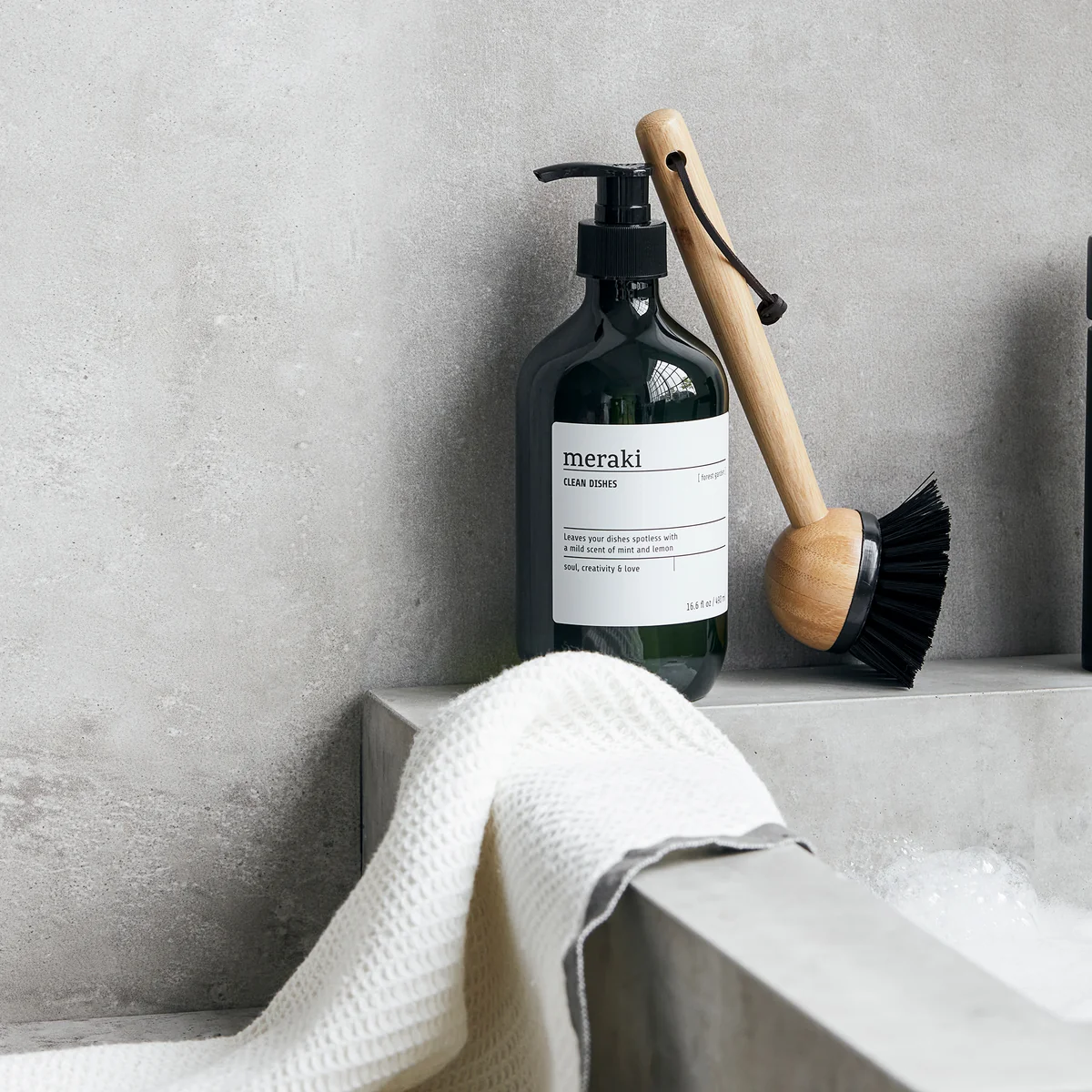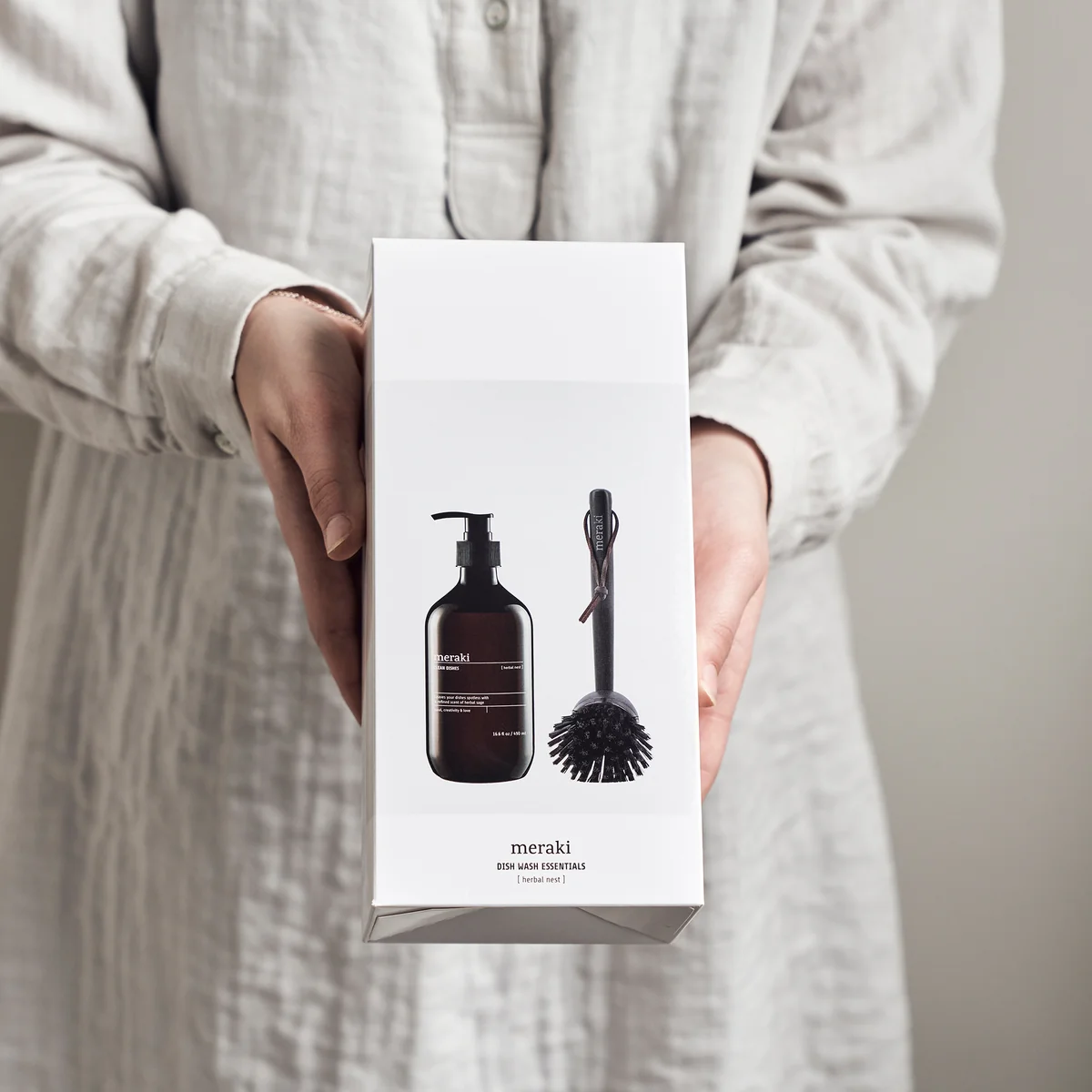 L'art d'offrir des cadeaux devient un jeu d'enfant avec ce set cadeau Dish Wash Essential de Meraki . Le set se compose d'une brosse à vaisselle et d'un produit vaisselle. La brosse a été conçue avec un manche en bambou et une tête amovible, ce qui la rend particulièrement facile à nettoyer. Le produit vaisselle s'appelle Blossom Breeze ou Forest Garden, il a reçu le label Nordic Ecolabel et a un merveilleux parfum d'orange ou de menthe et de citron. Il convient également pour le nettoyage quotidien des sols, des murs et du verre.